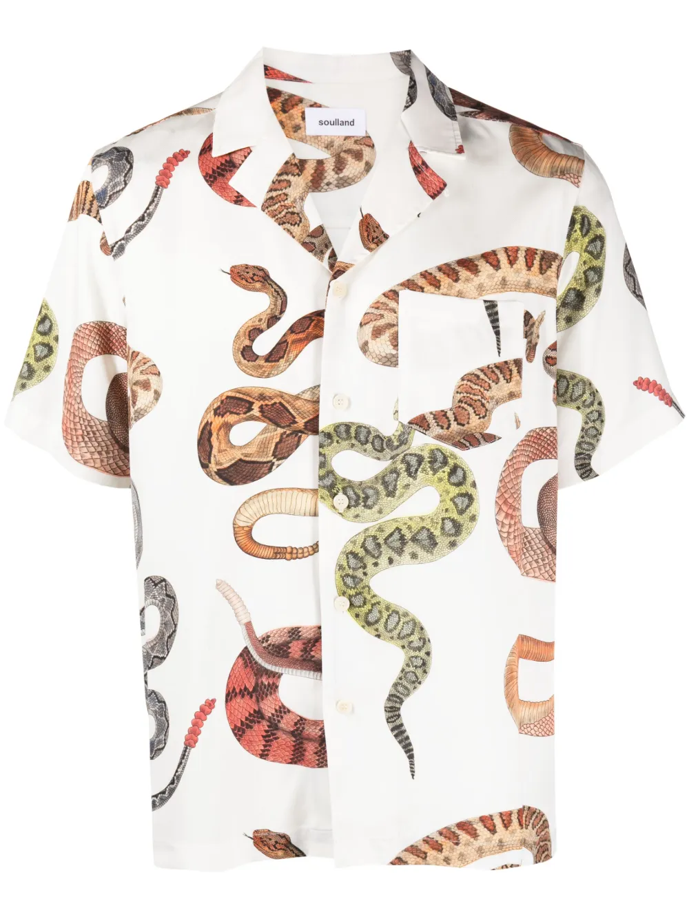 Blanco y multicolor, TENCEL™, estampado gráfico en toda la pieza, cuello cubano, manga corta y dobladillo recto.