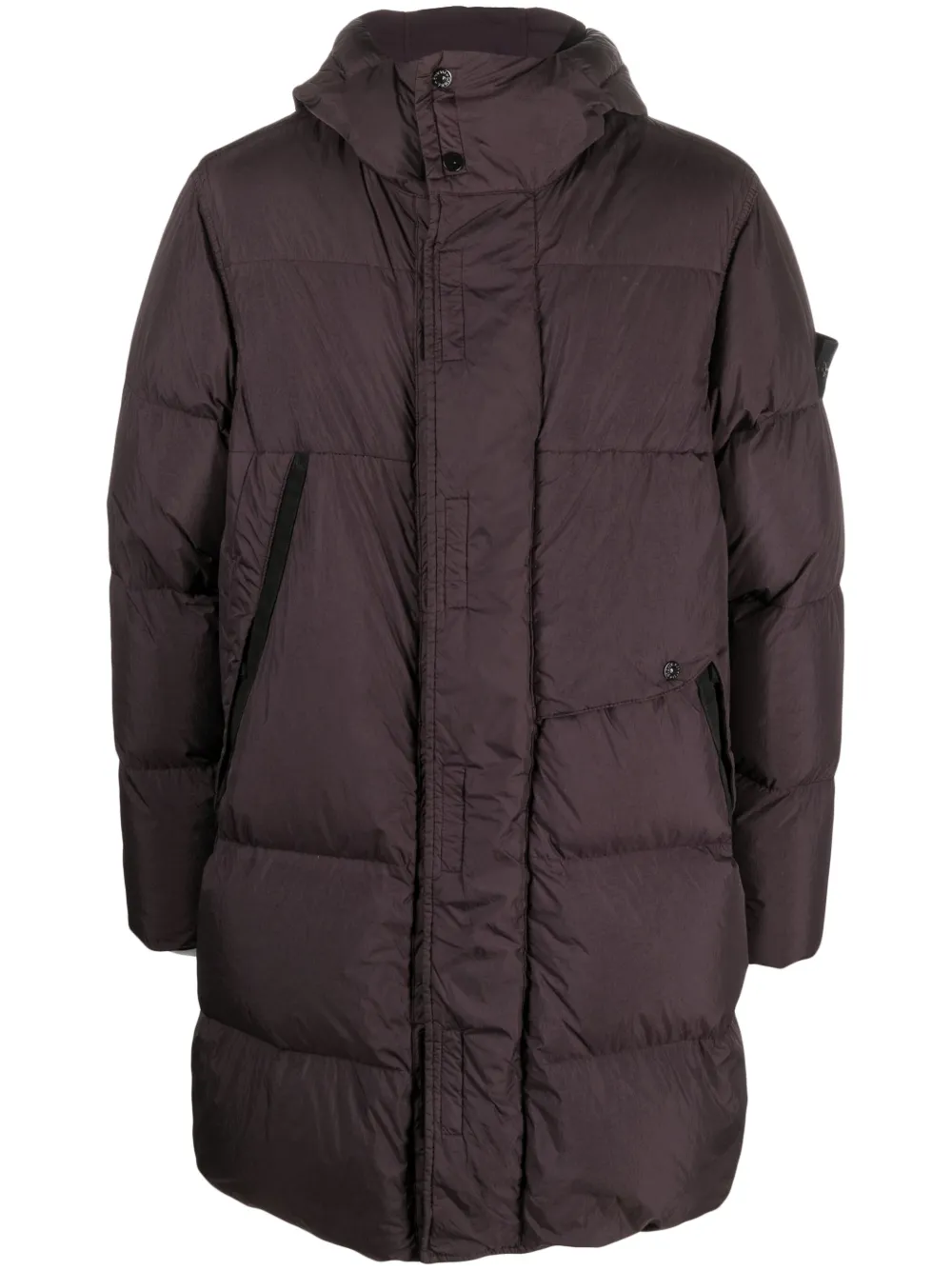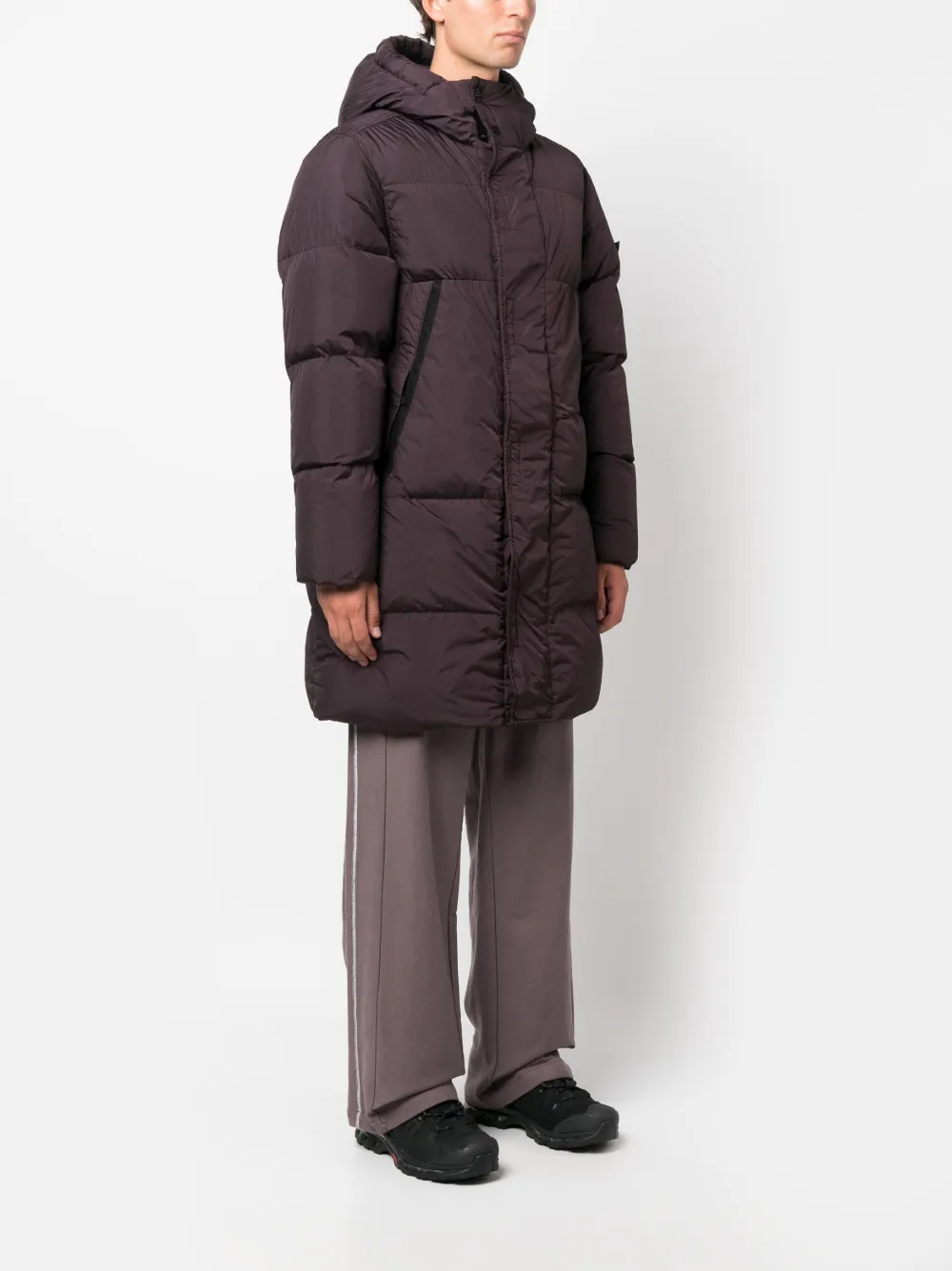 Morado plum, plumón de pato, motivo Compass característico, prenda teñida, diseño con capucha, cierre oculto en la parte delantera, manga larga y dos bolsillos laterales con cremallera.