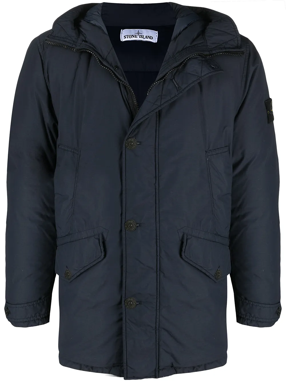 Diseño acolchado, relleno de plumón, dos bolsillos con cremallera en el pecho, dos bolsillos con solapa en la parte delantera, diseño con capucha, manga larga, cierre con botones en la parte delantera y cierre con cremallera oculta en la parte delantera.