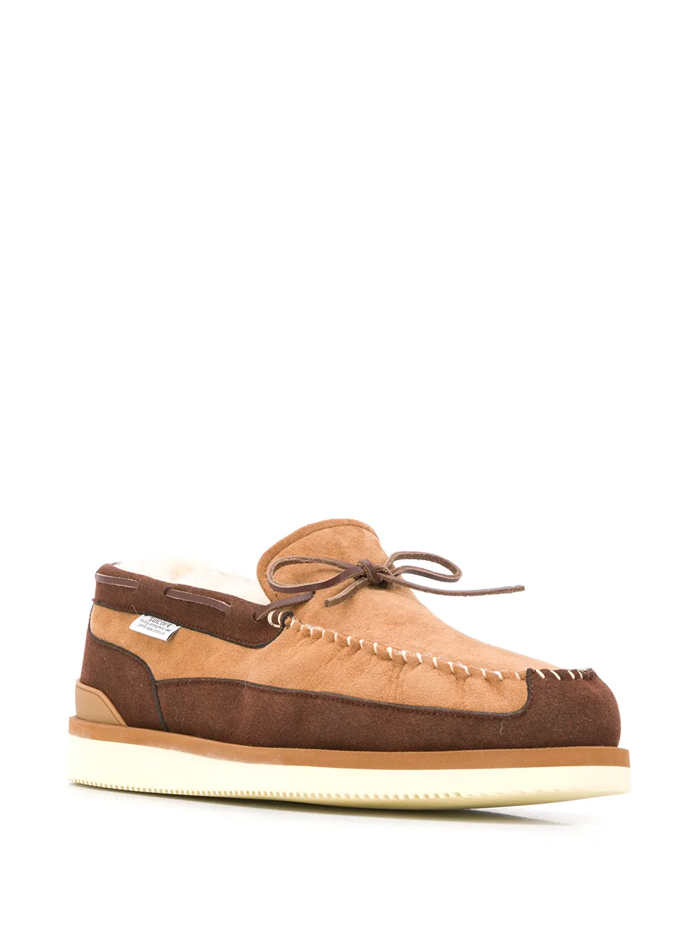 Mocasines con paneles en ante de Suicoke con suela blanca de goma, forro de lana y detalle de lazo.