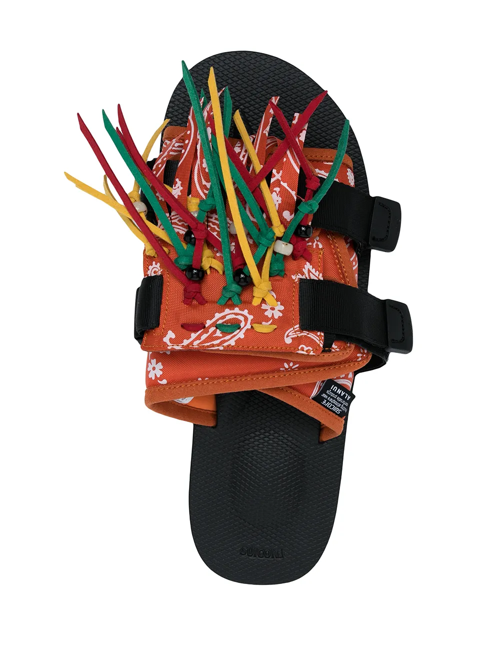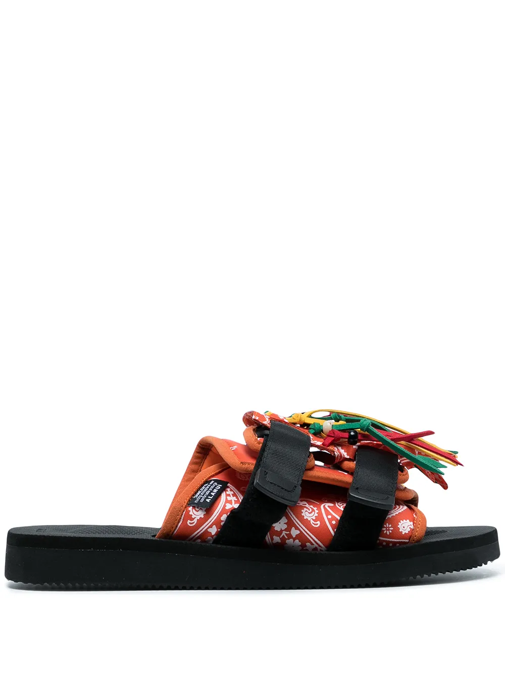 Detalle de flecos, parche del logo en la parte delantera, plantilla con logo, puntera abierta, cierre autoadherente en la parte delantera, estilo slip-on