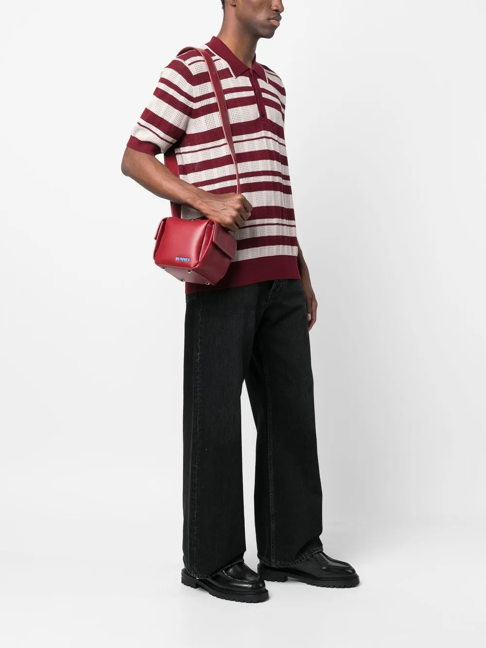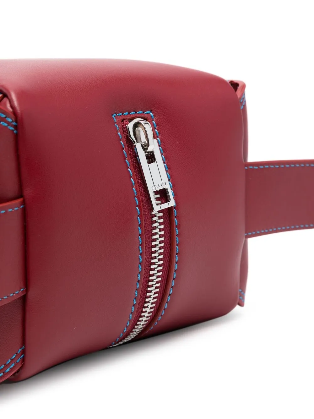 Rojo amapola, piel de becerro, costura en contraste, placa del logo, correa de hombro ajustable, cierre con cremallera en el tope, compartimento principal, parche del logo en el interior, dos bolsillos laterales con solapa, base de apoyo de metal y forro de lona.