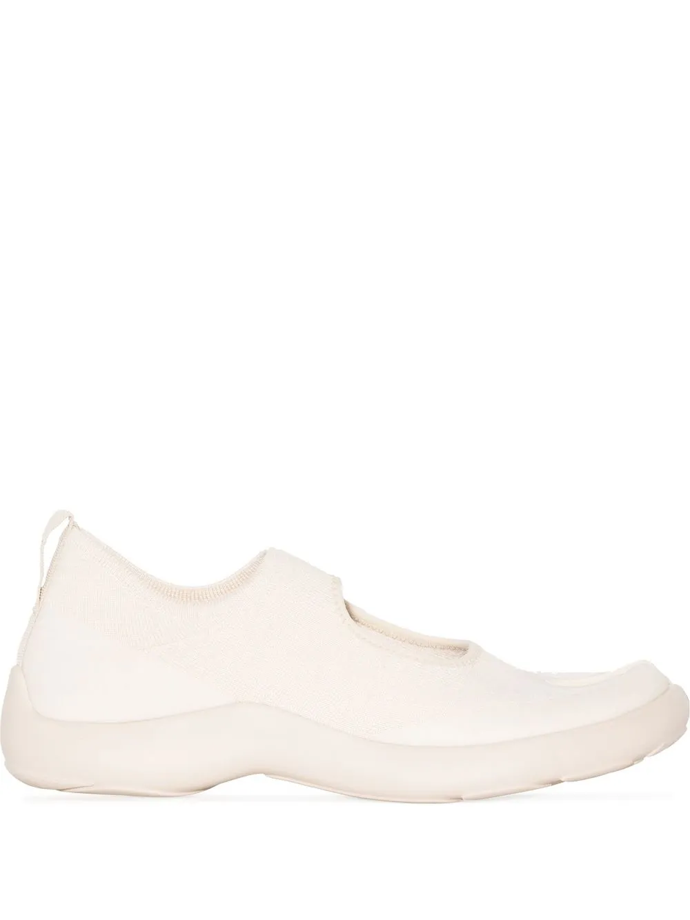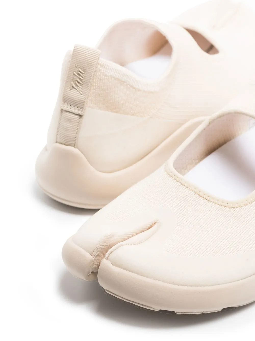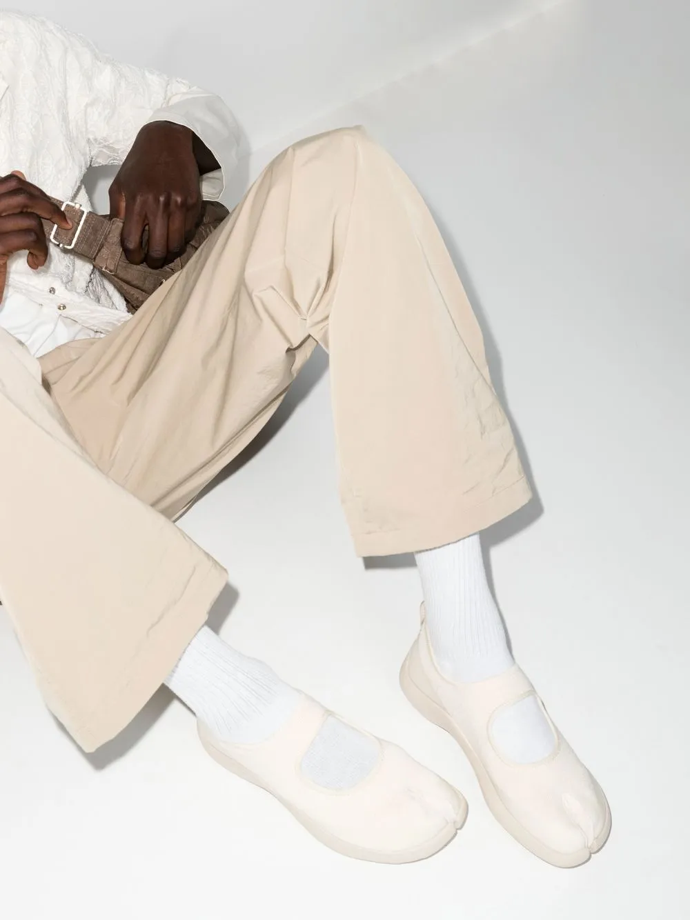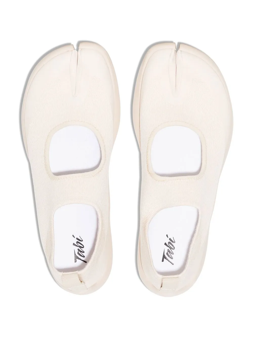 Blanco, estructura de punto, detalle de aberturas, puntera Tabi característica, estilo slip-on