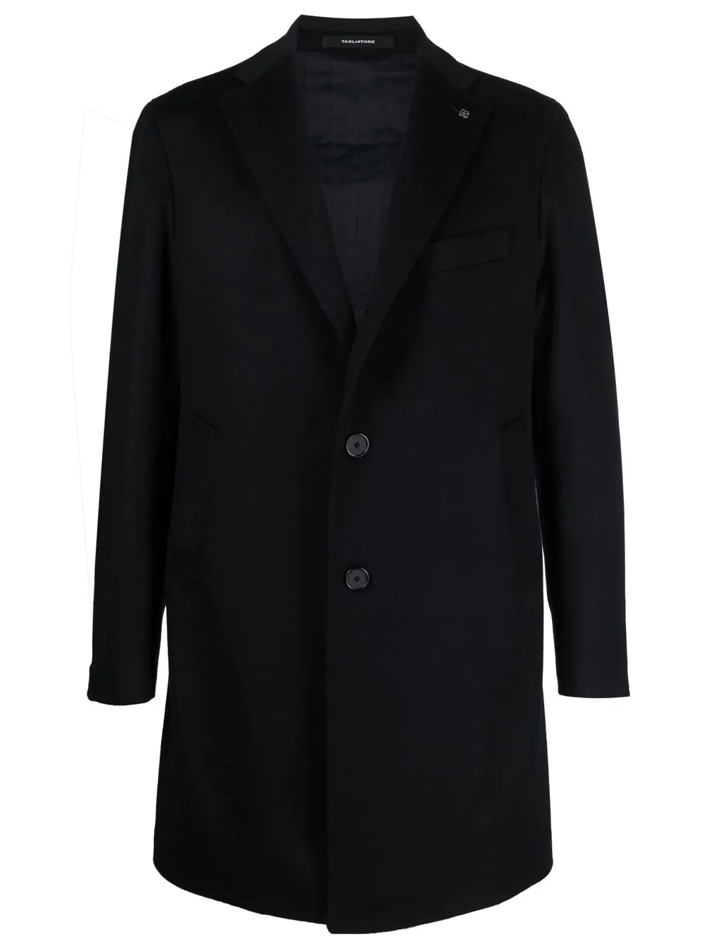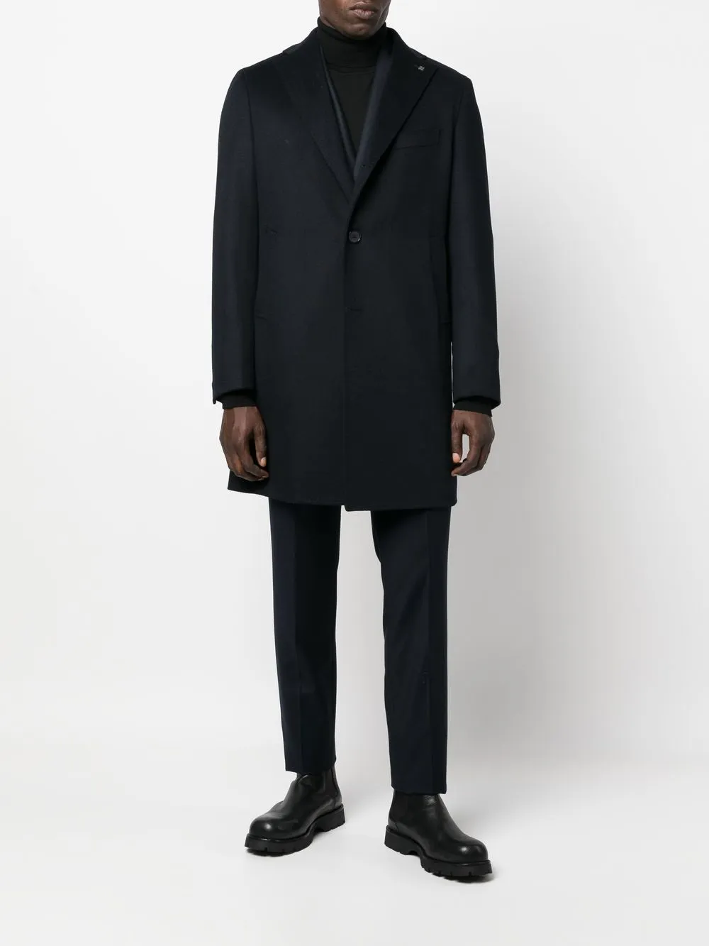 Azul marino, mezcla de lana virgen, diseño con solapas, cierre con botones en la parte delantera, manga larga, dos bolsillos diagonales en los laterales y abertura en la parte posterior.