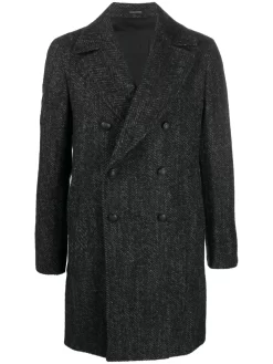 Arden double-breasted coat from TAGLIATORE featuring anthracite grey, wool blend, chevron knit, notched lapels, double-breasted button fastening, long sleeves, buttoned cuffs, chest welt pocket, central rear vent, thigh-length and straight hem.