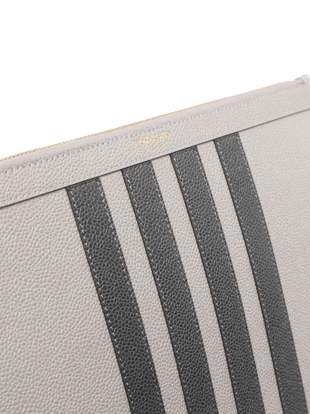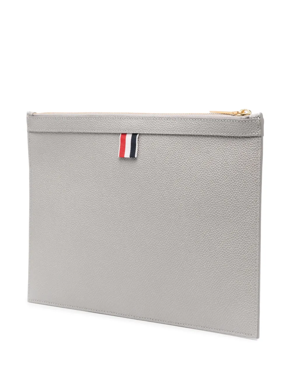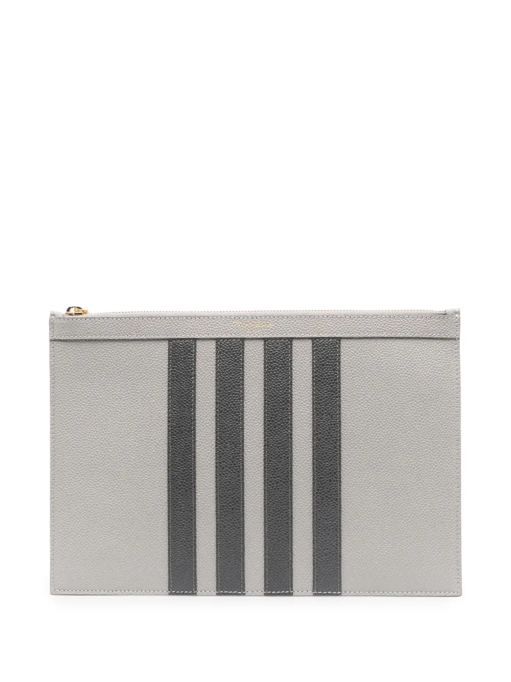 Gris claro, piel de becerro, textura granulada, detalle de rayas, estampado del logo en la parte delantera, parche del logo en la parte posterior, cierre con cremallera en el tope, compartimento principal y parche del logo en el interior.