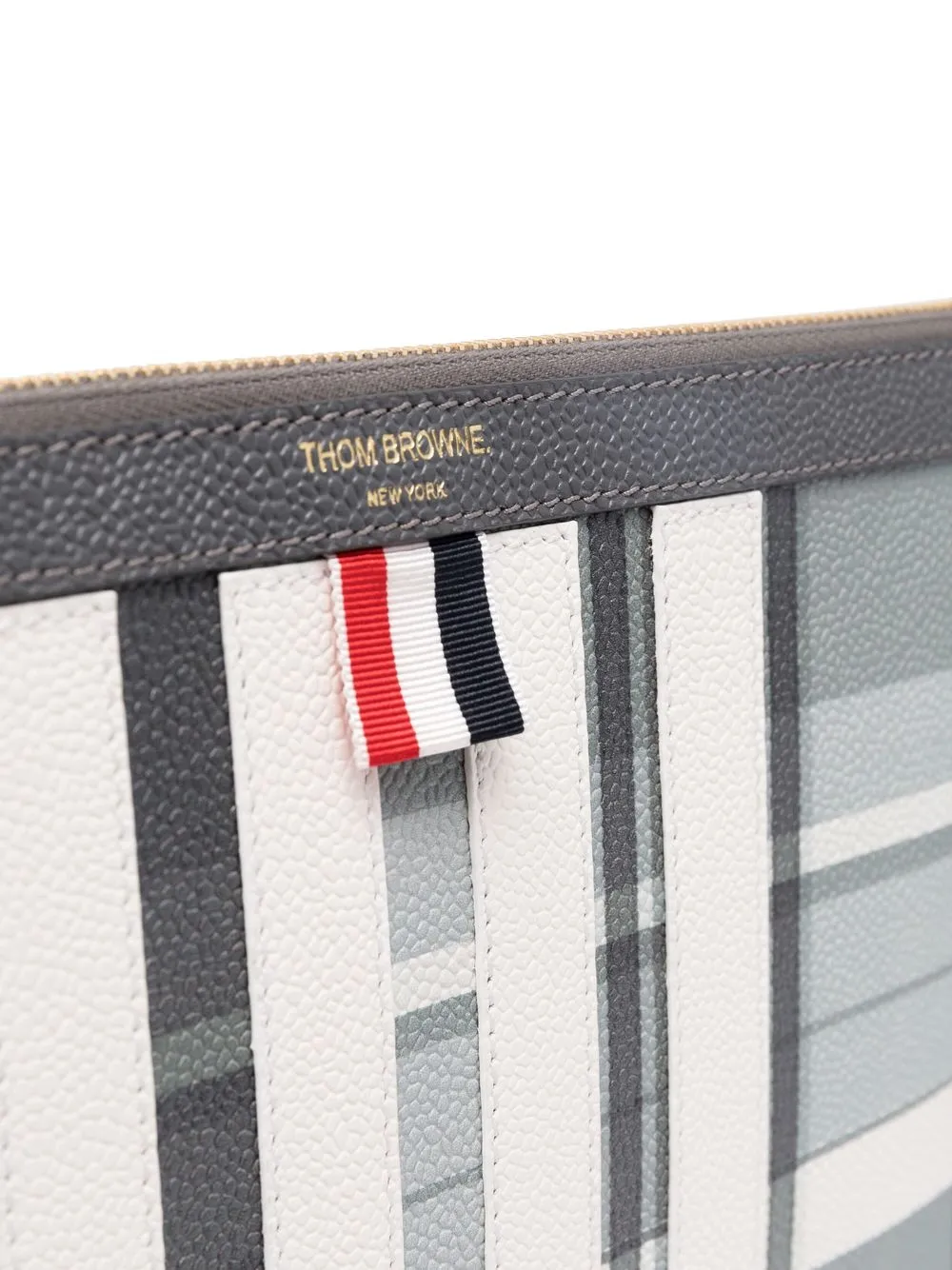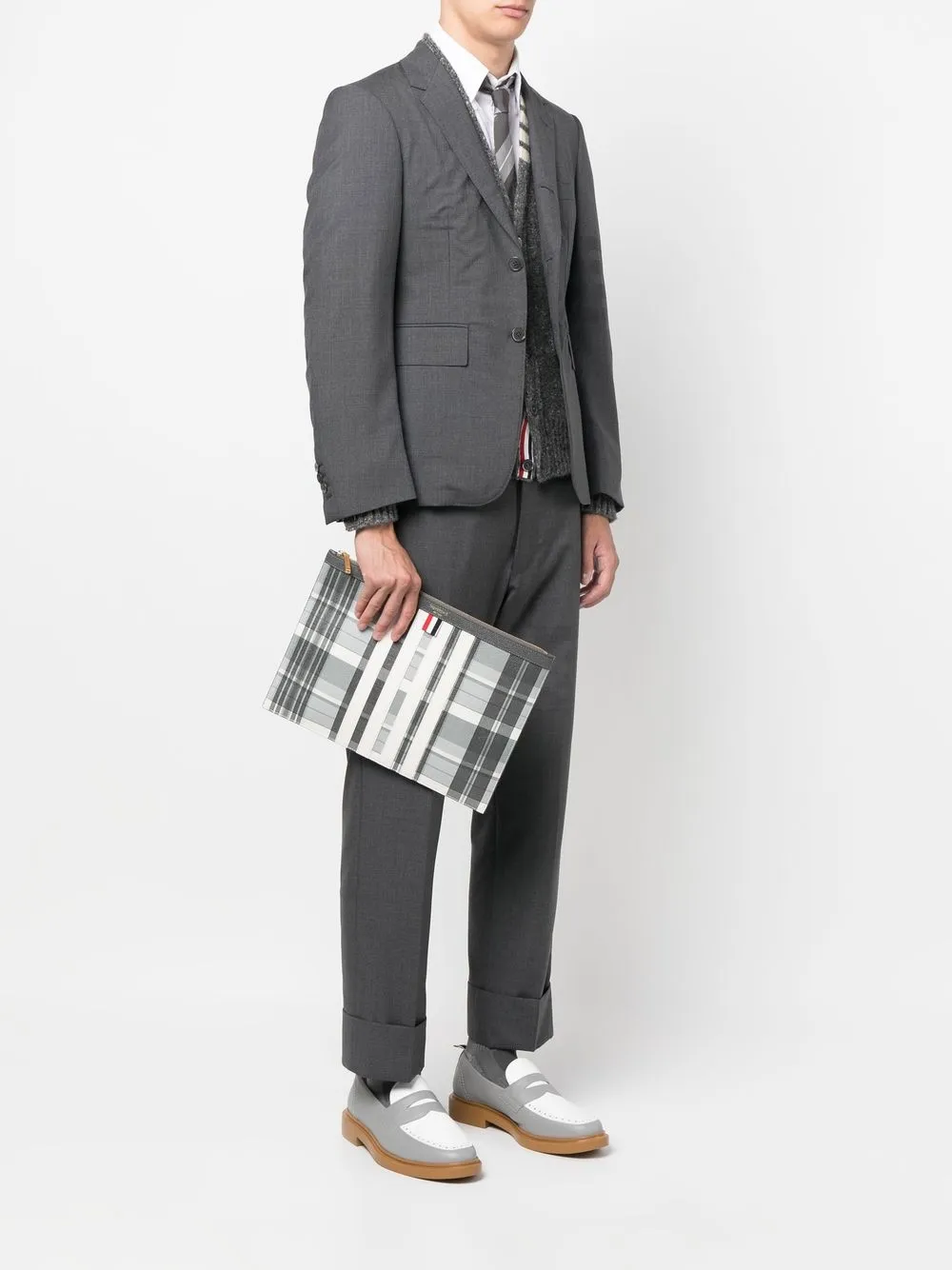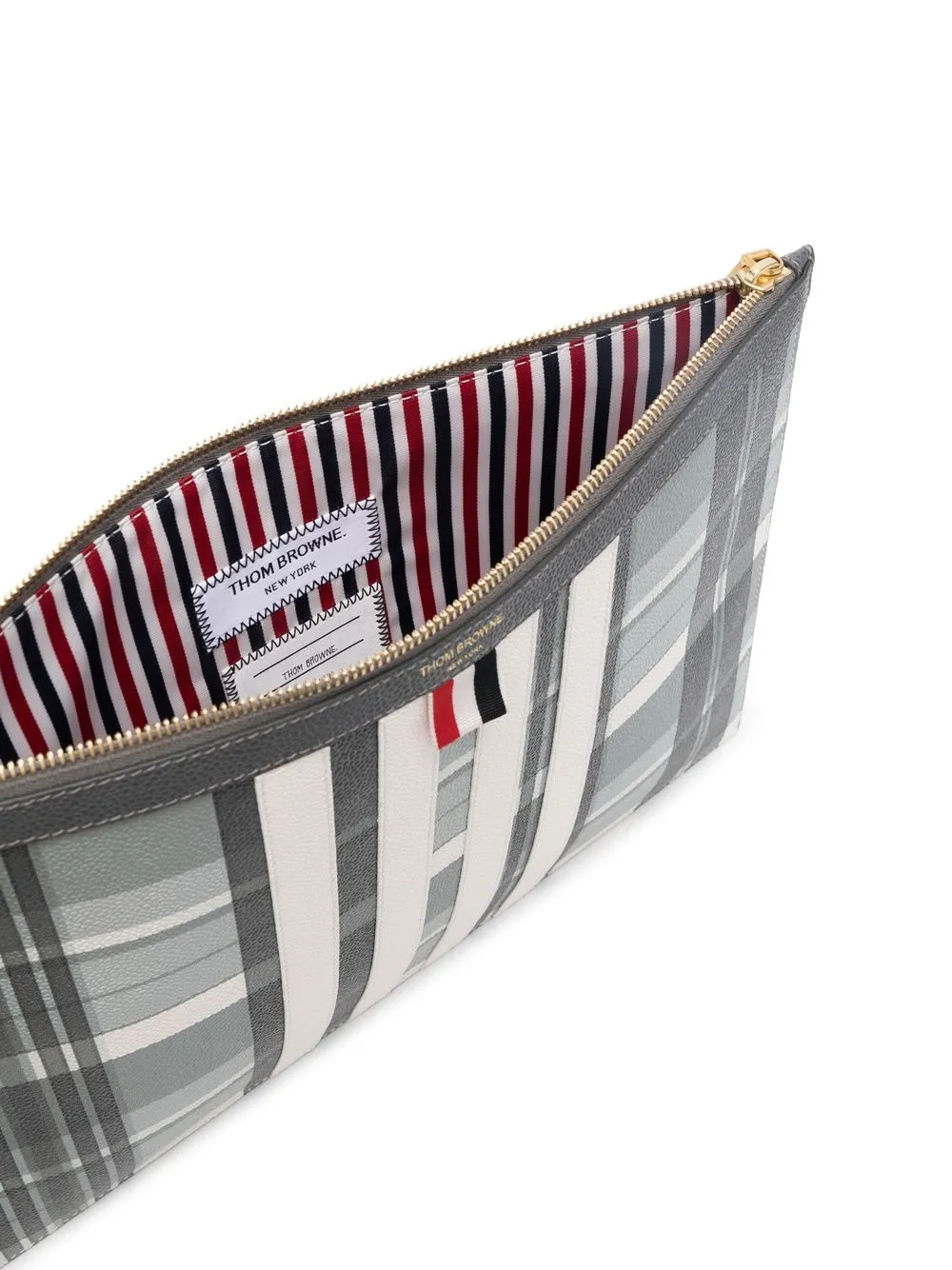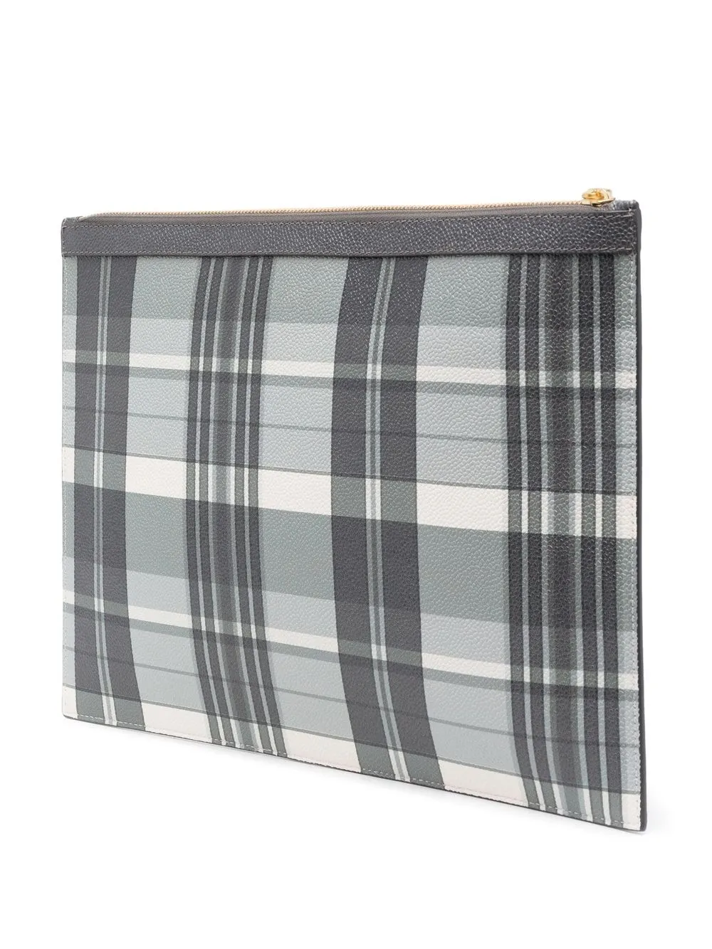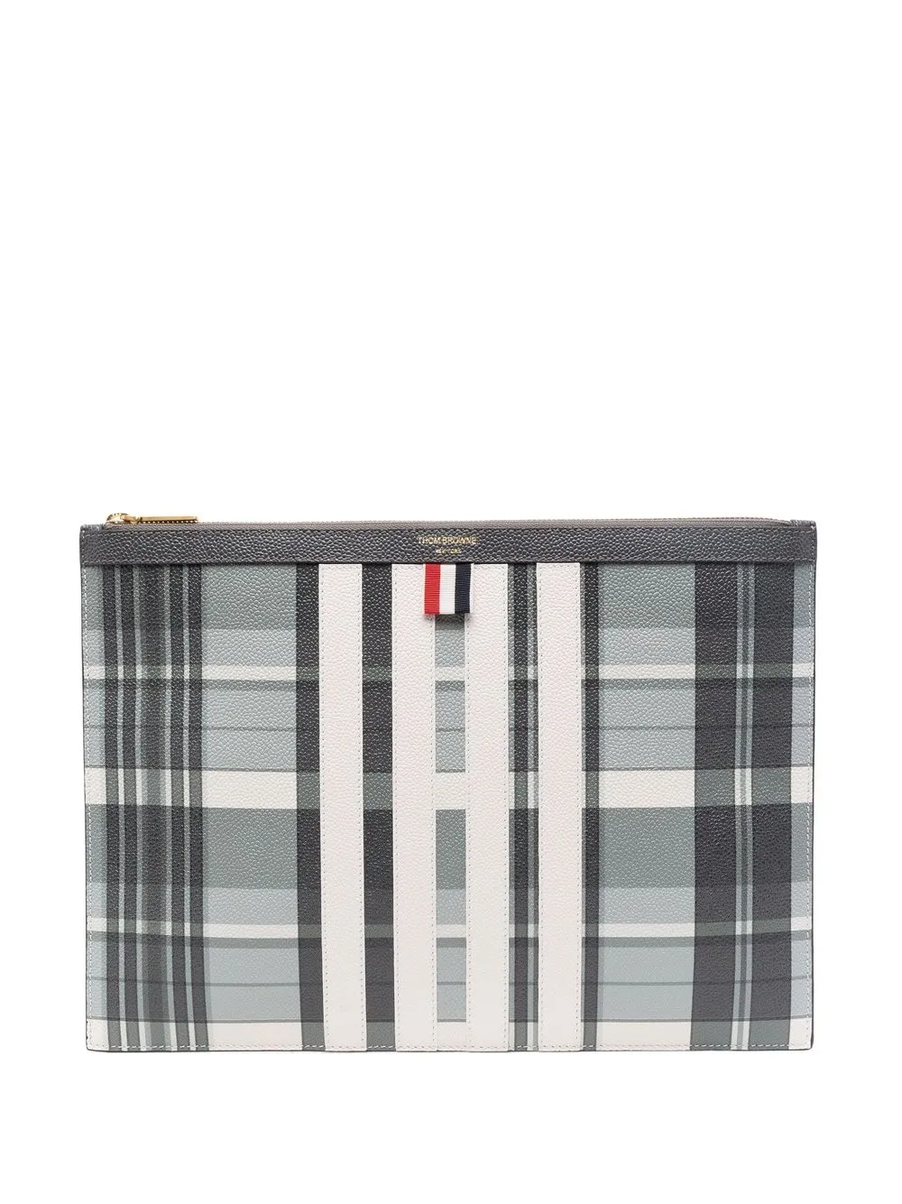 Gris, cuero, motivo a cuadros, aplique de grosgrain de la marca, estampado del logo en la parte delantera, cierre con cremallera en el tope y compartimento principal.