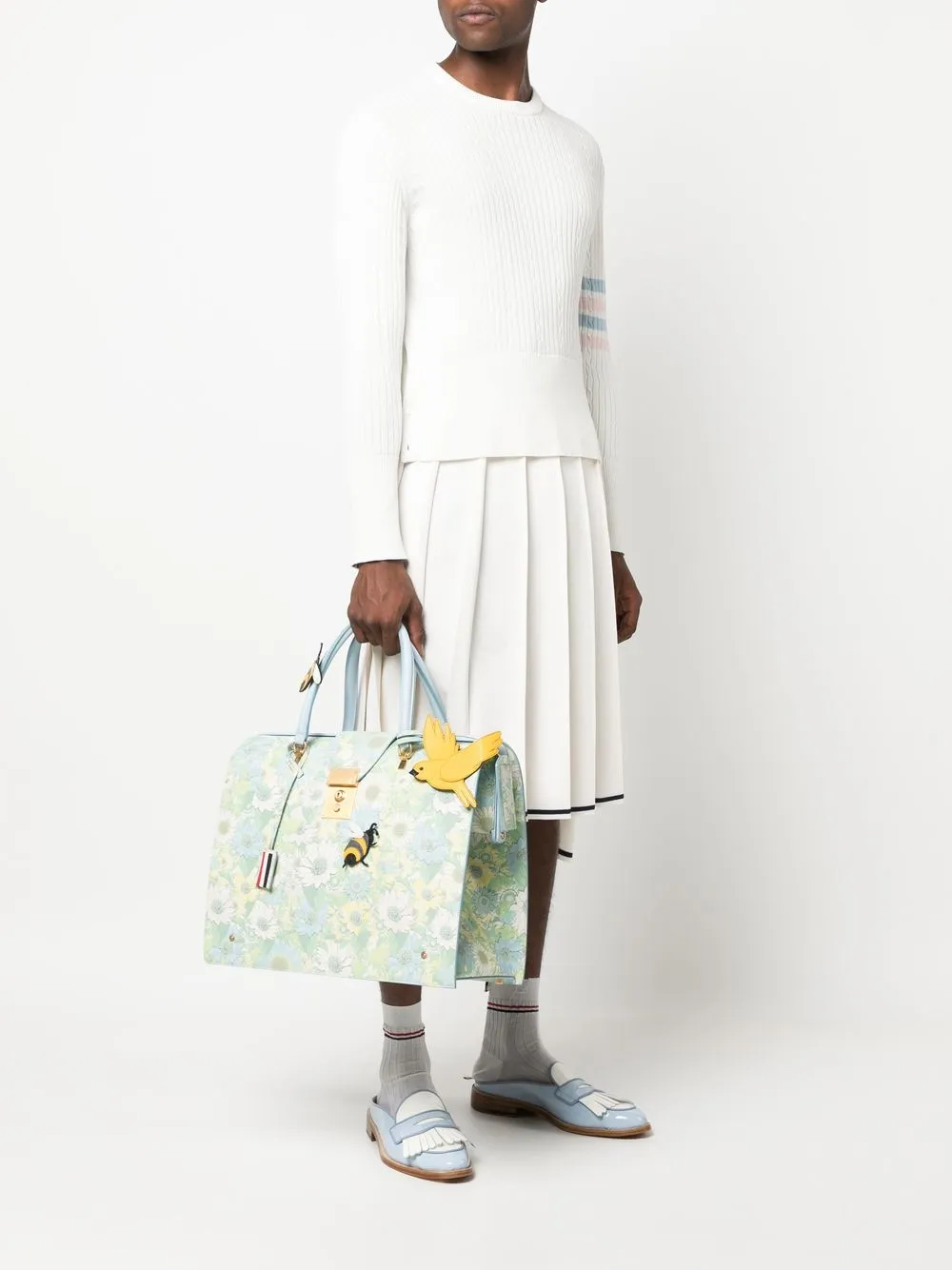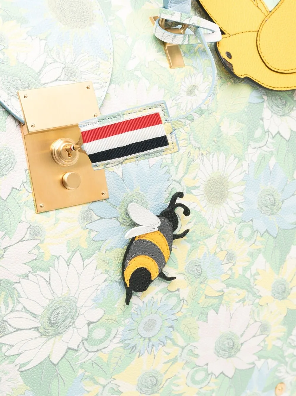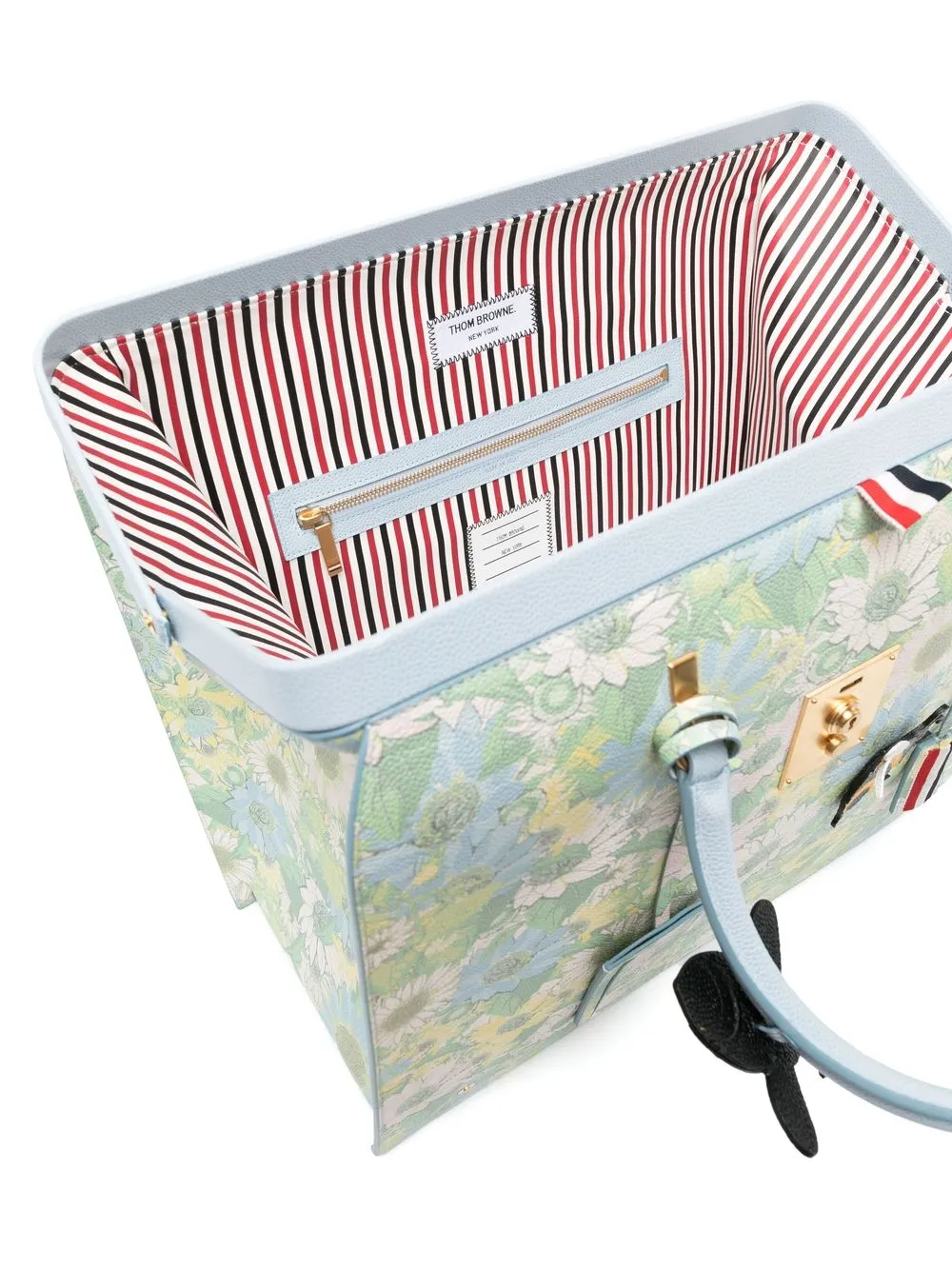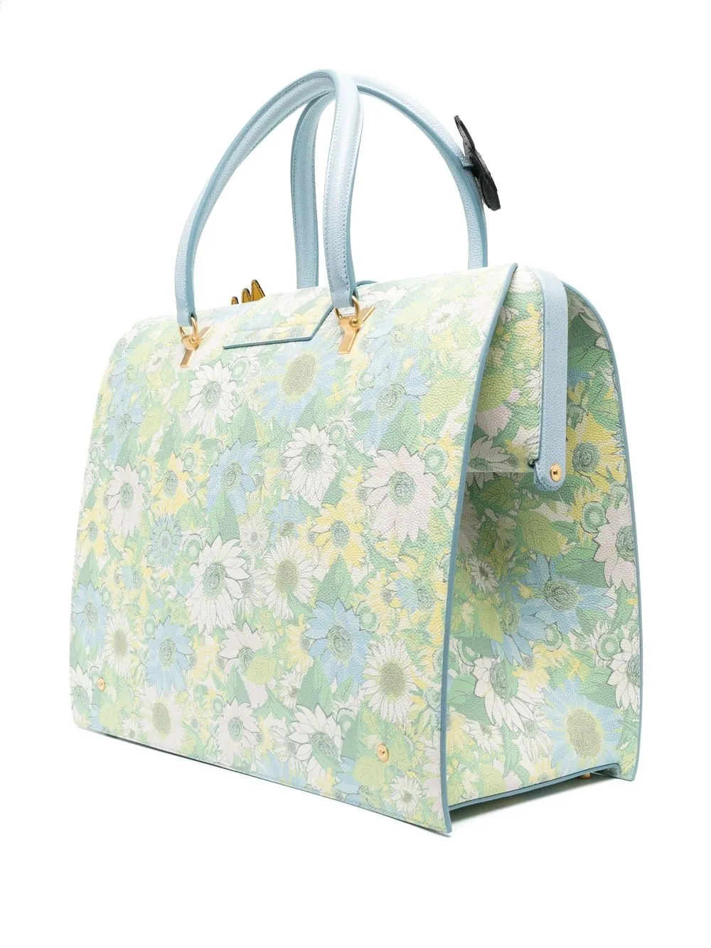 Verde menta, piel de becerro, estampado floral, aplique de grosgrain de la marca, detalle de apliques, acabado en tono dorado, dos asas redondas en la parte superior, compartimento principal, cierre con broche, forro con rayas RWB y compartimento principal.