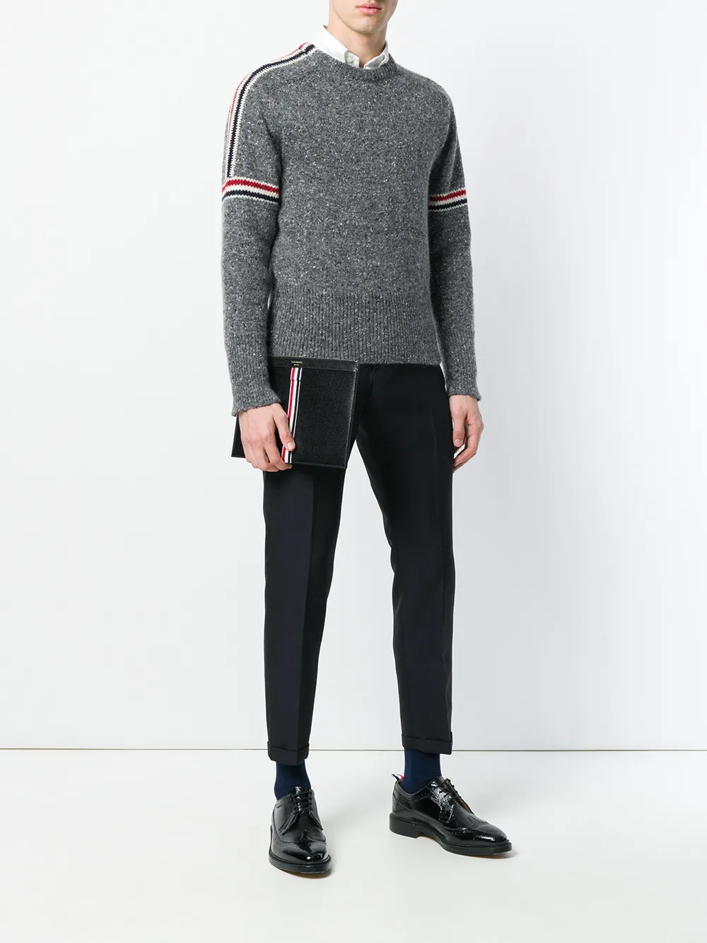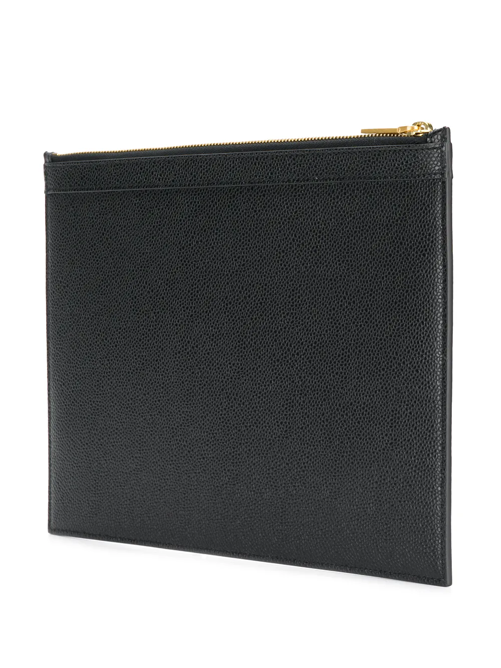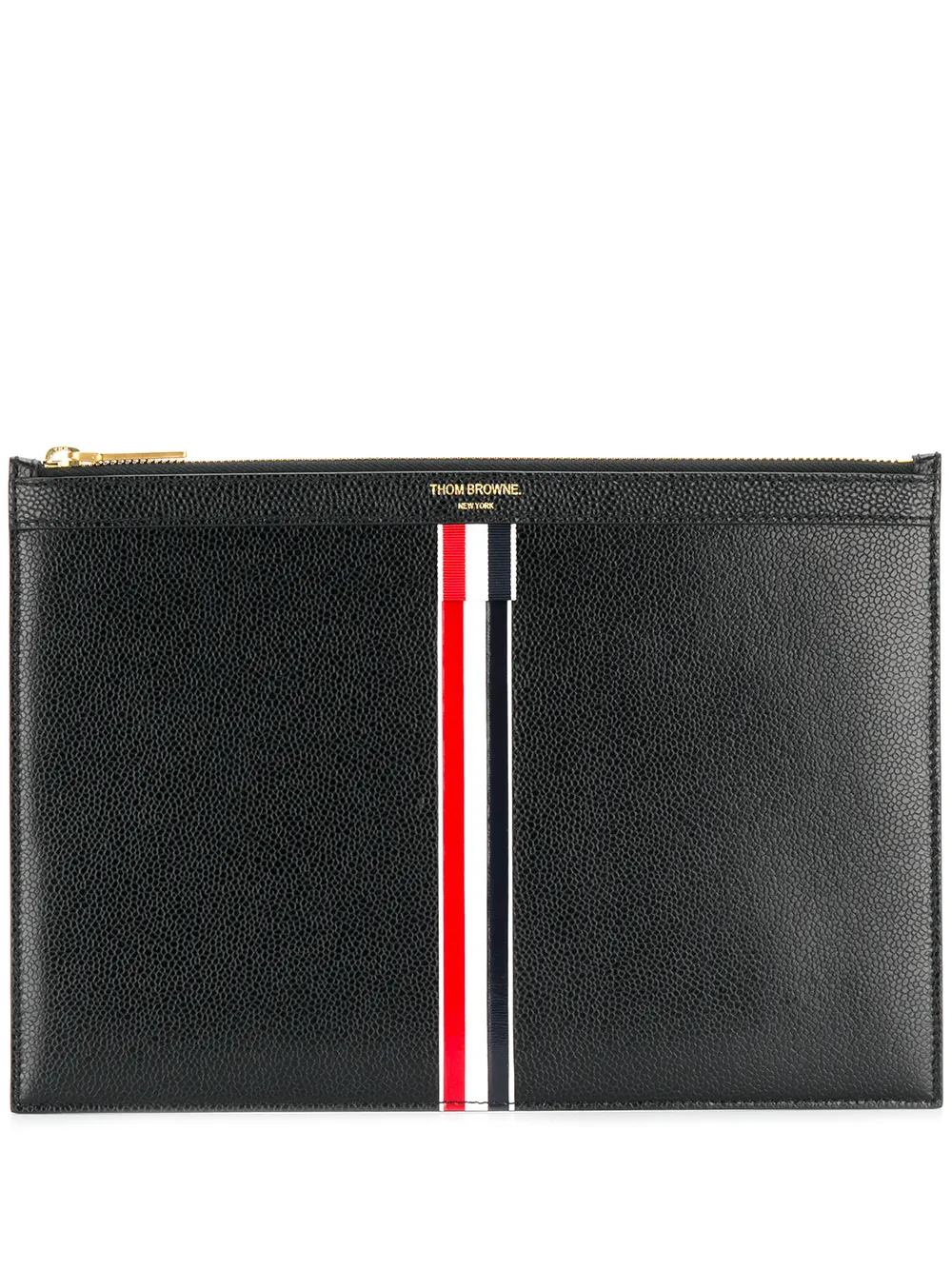 Funda pequeña para tablet con cremallera en cuero de color negro de Thom Browne con logo en la parte central, aplique tricolor característico de la marca, detalles en tono dorado, cierre con cremallera en la parte de arriba, placa del logo en el interior y forro.