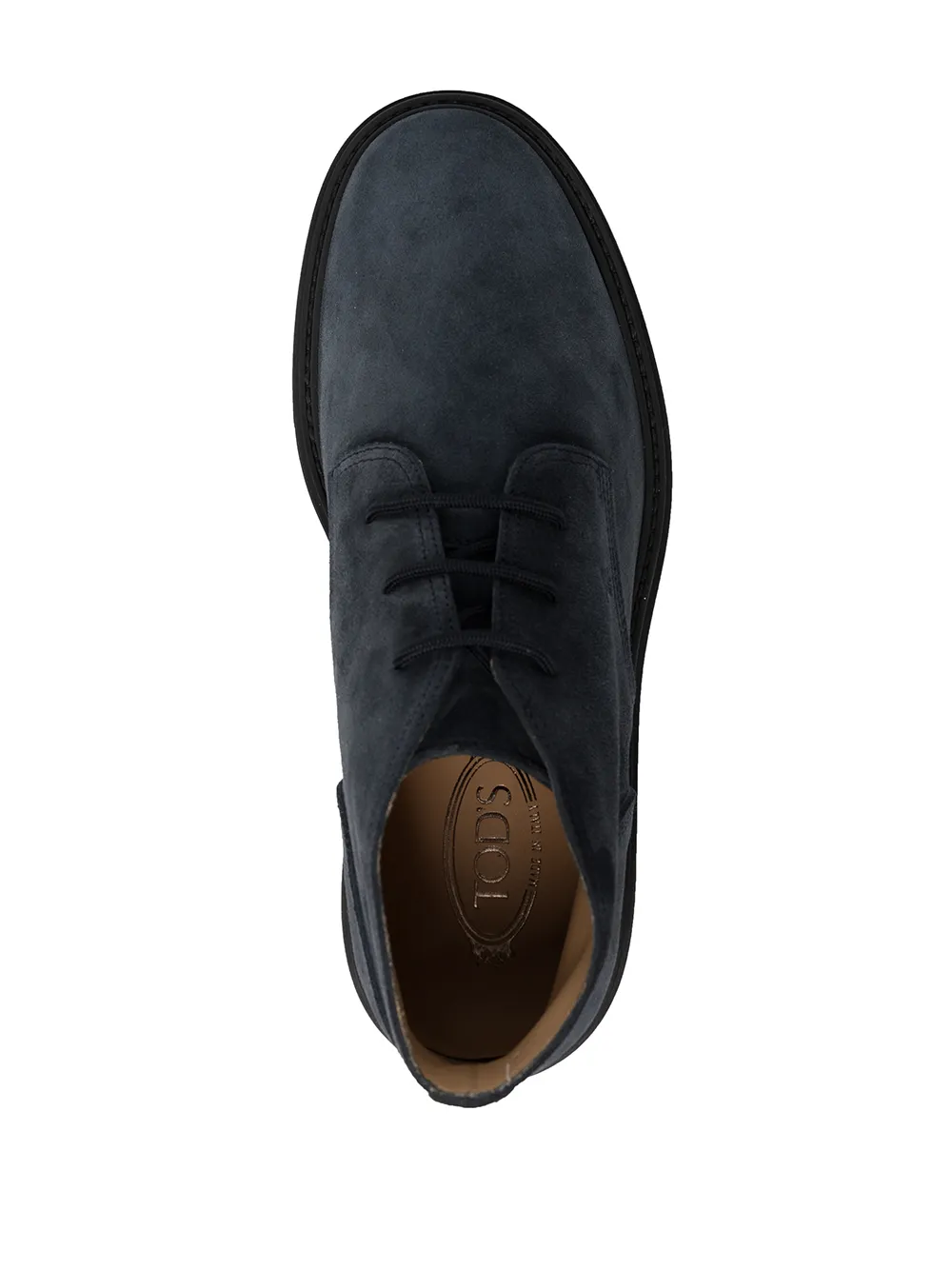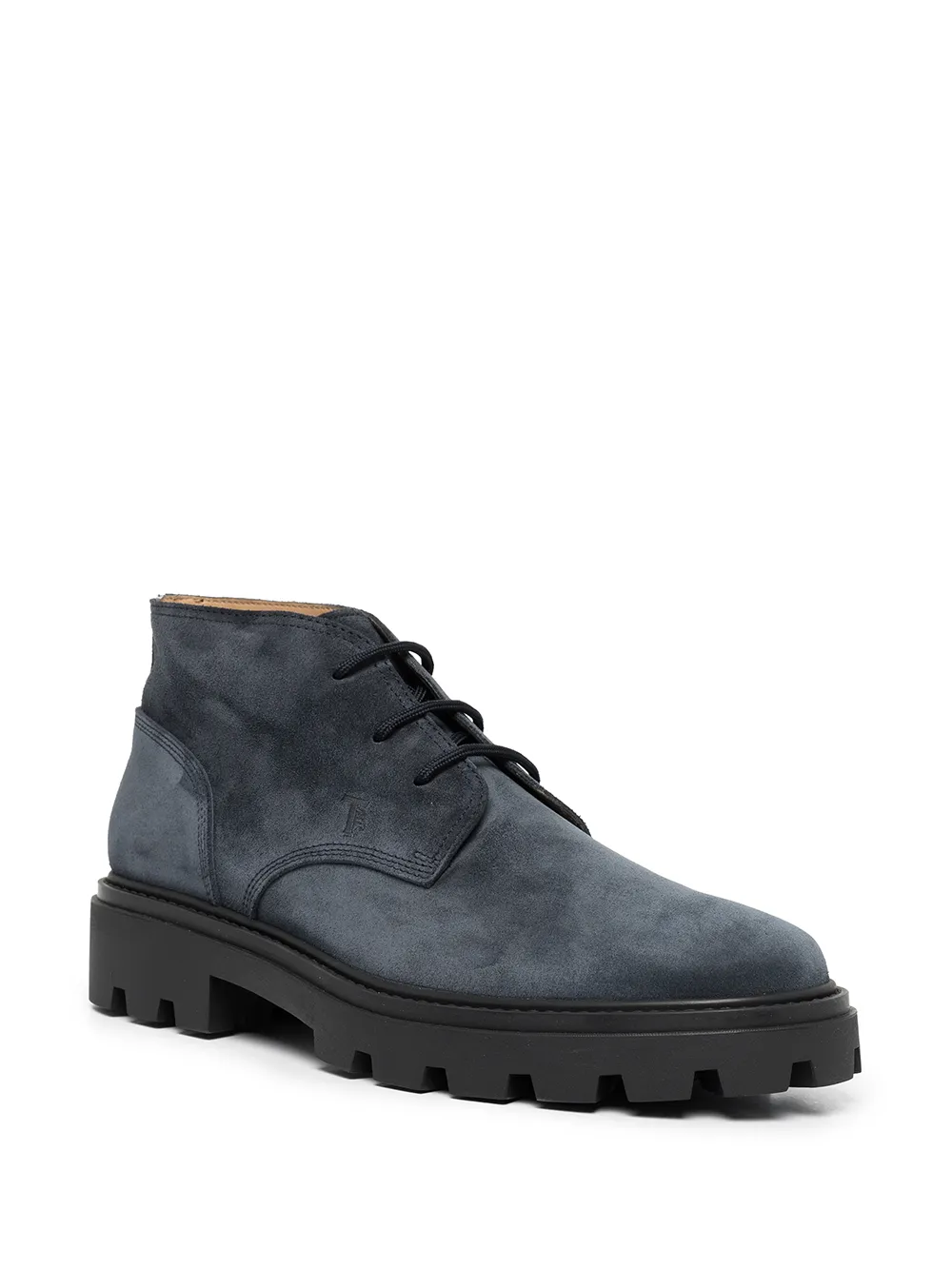 Azul, ante, suela gruesa de goma dentada, cierre con cordones en la parte delantera, plantilla con logo y puntera redonda.