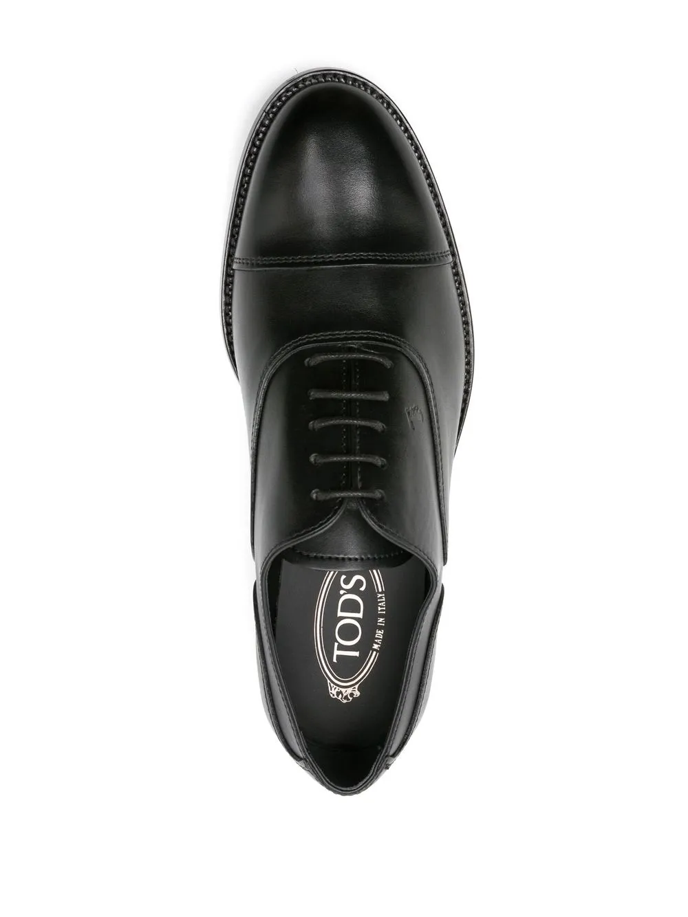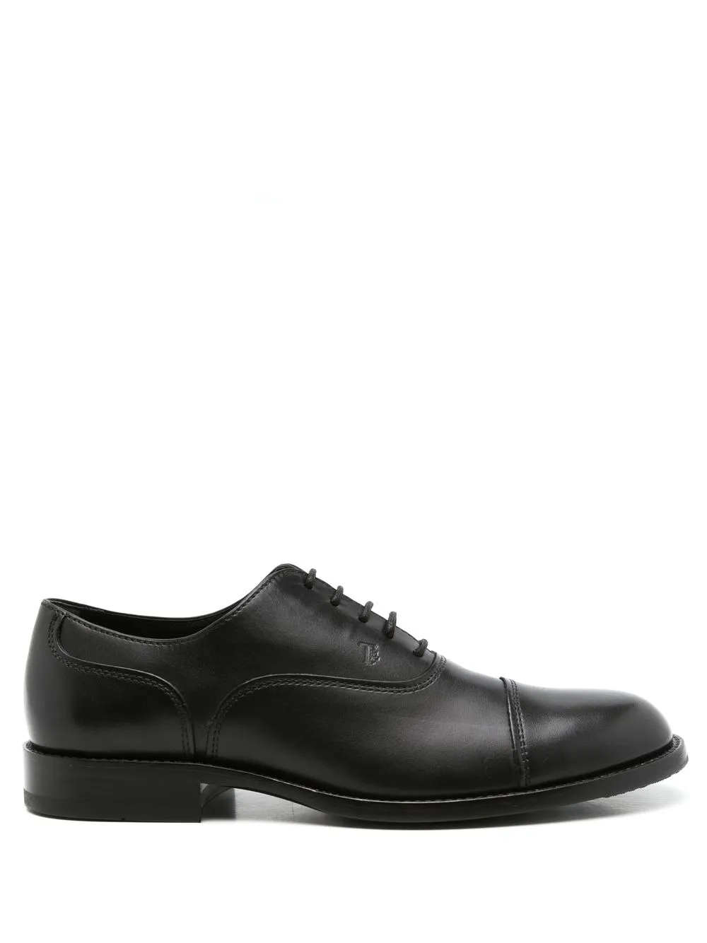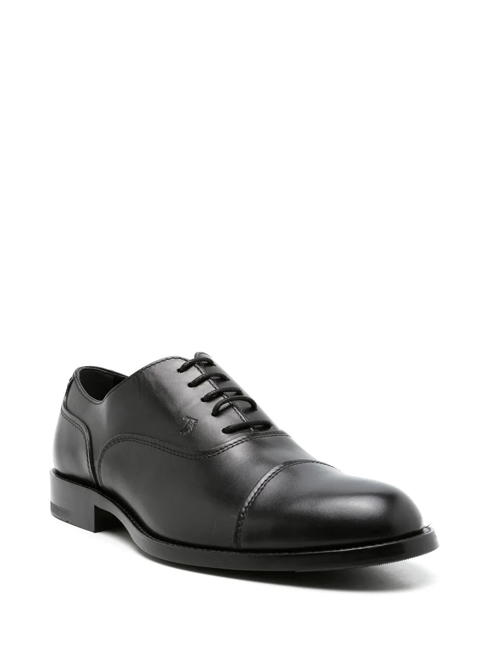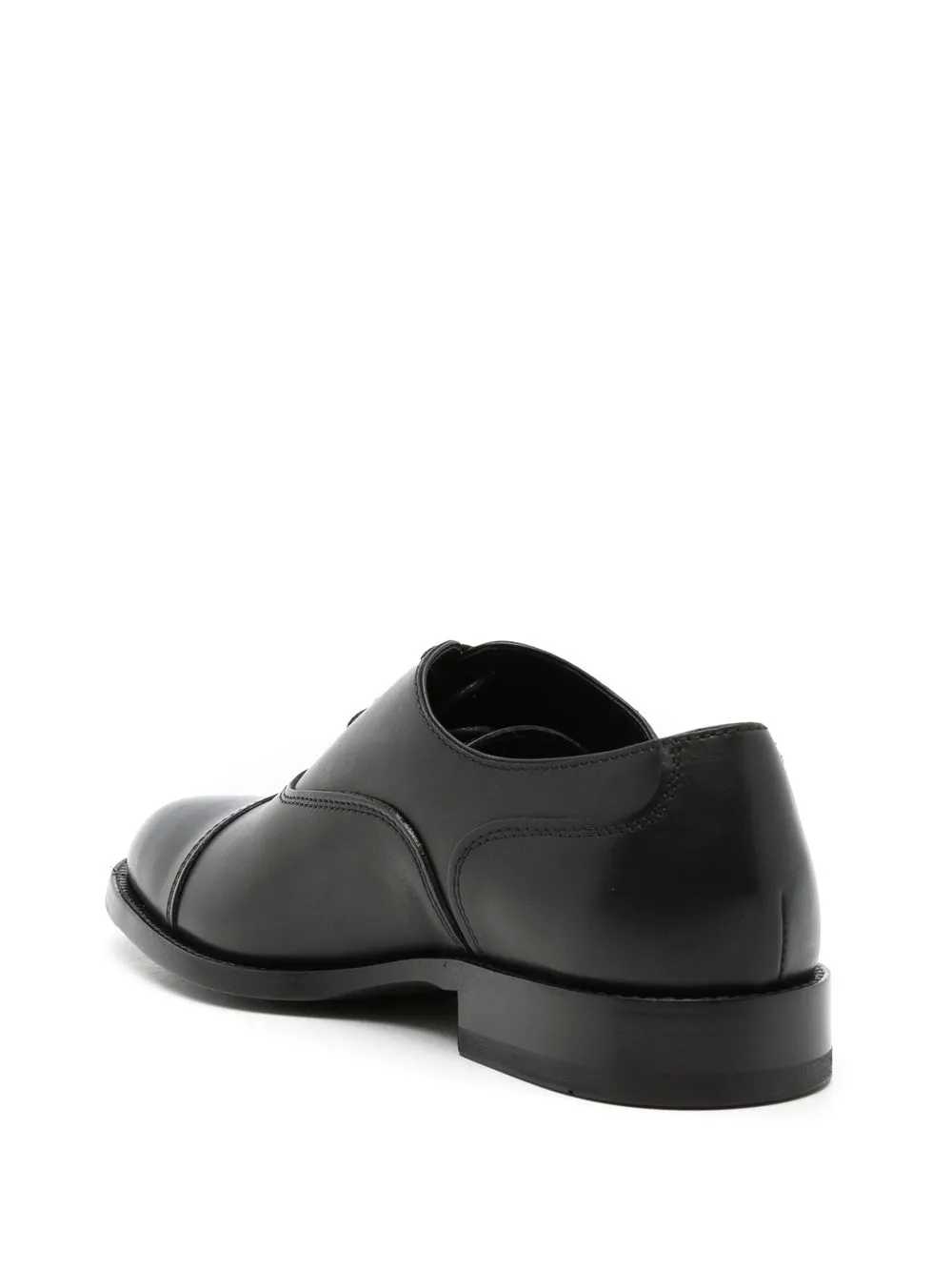 Negro, piel de becerro, grano suave, acabado pulido, sello del logo en la parte delantera, plantilla con logo, puntera redonda, cierre con cordones en la parte delantera y suela plana.