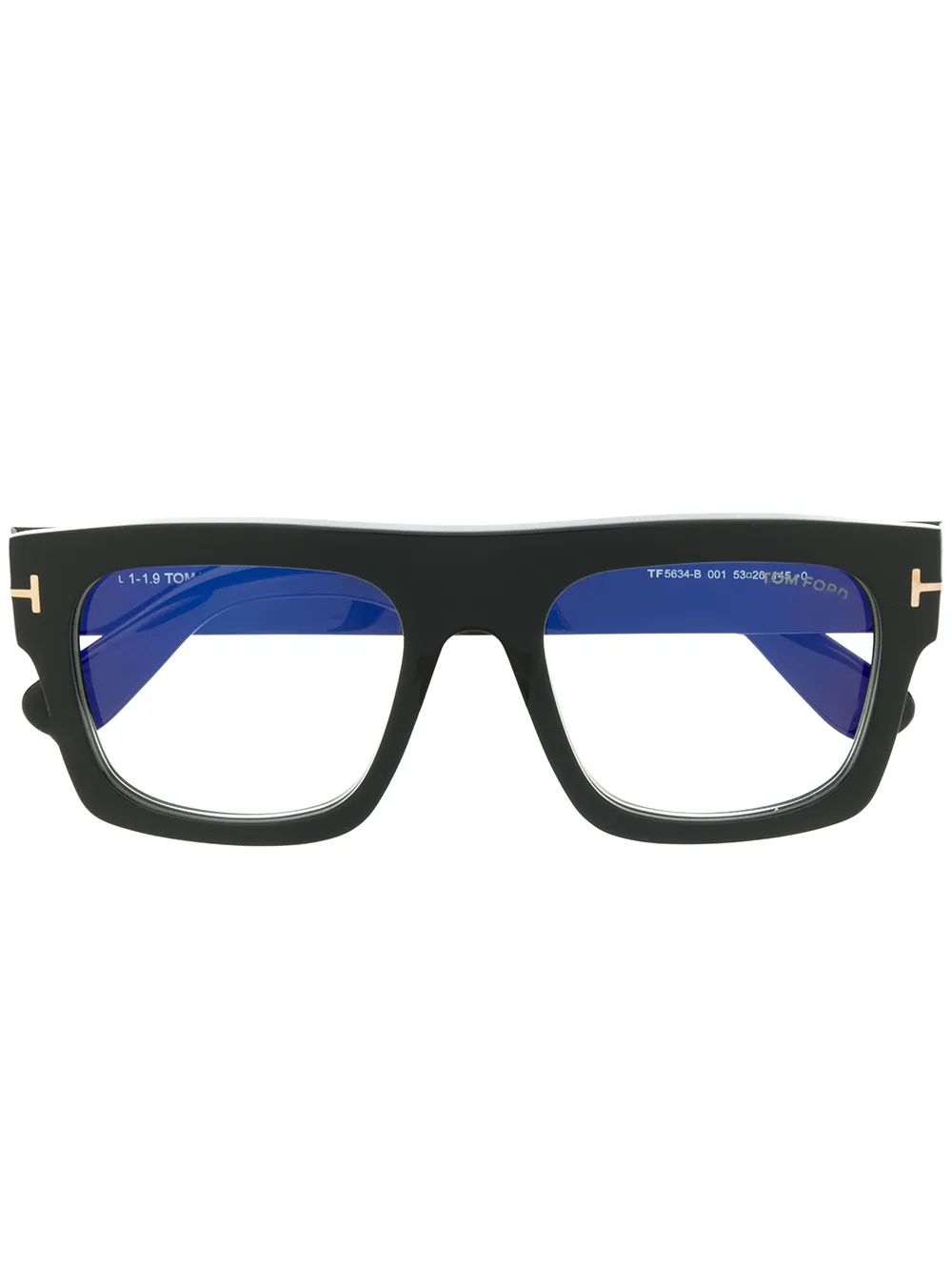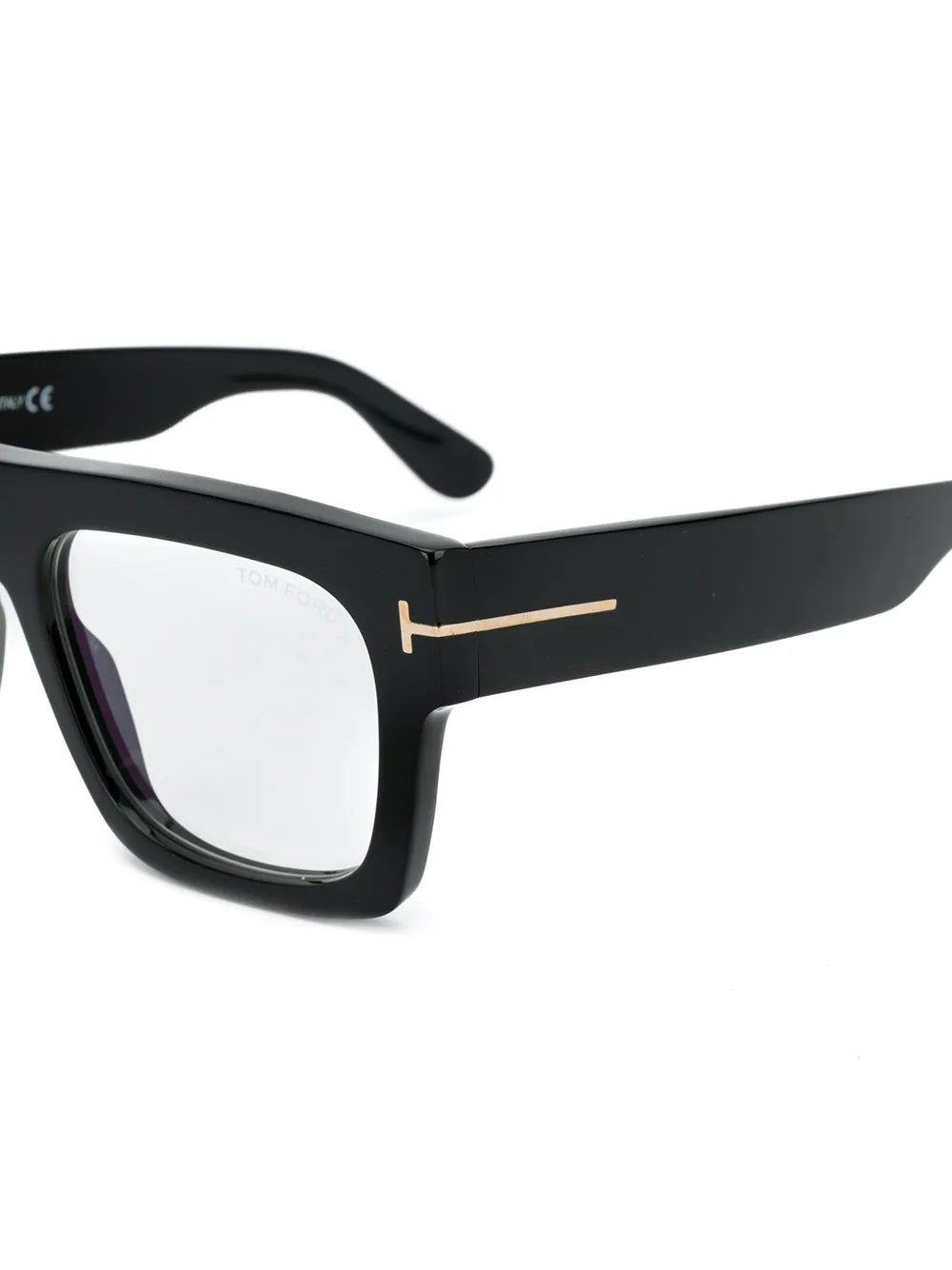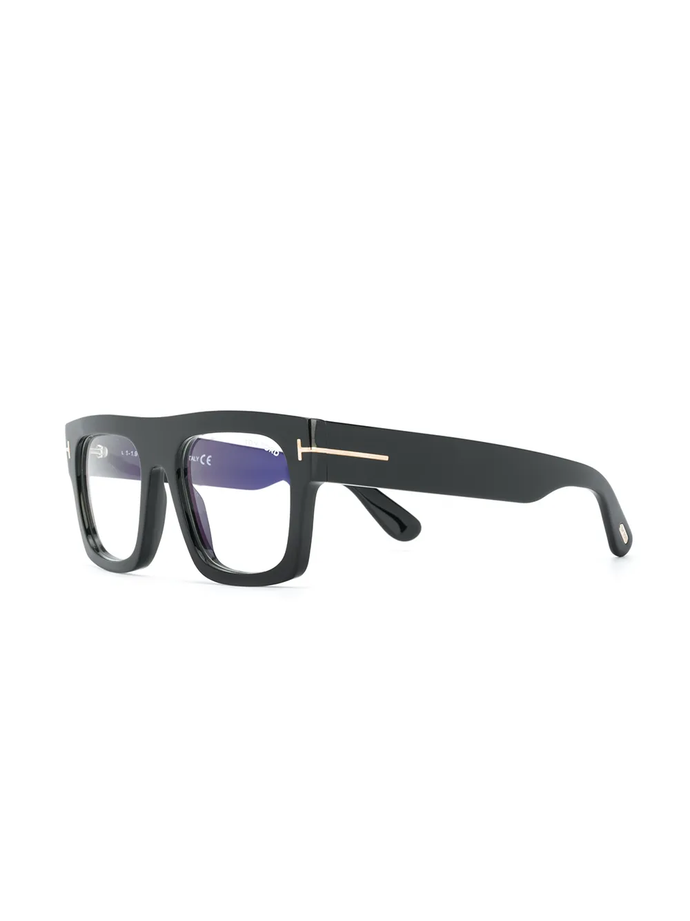 Gafas con montura cuadrada gruesa de TOM FORD EYEWEAR con patillas rectas con puntas curvadas, detalles en tono dorado claro, estructura plegable, logo en el frente y logo de la marca en la parte interna de la patilla. Este artículo es unisex. Este artículo viene con un estuche de protección.
