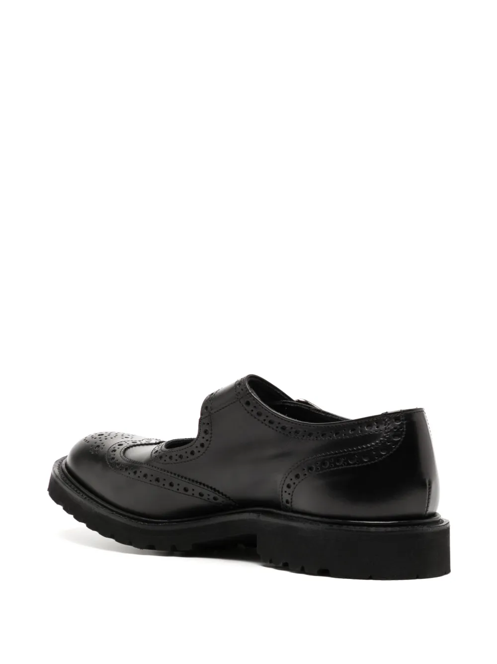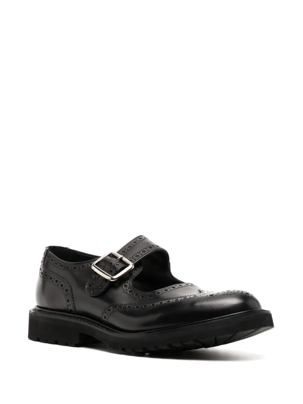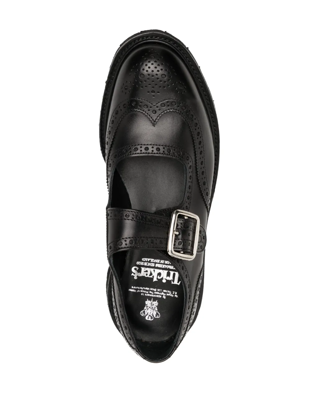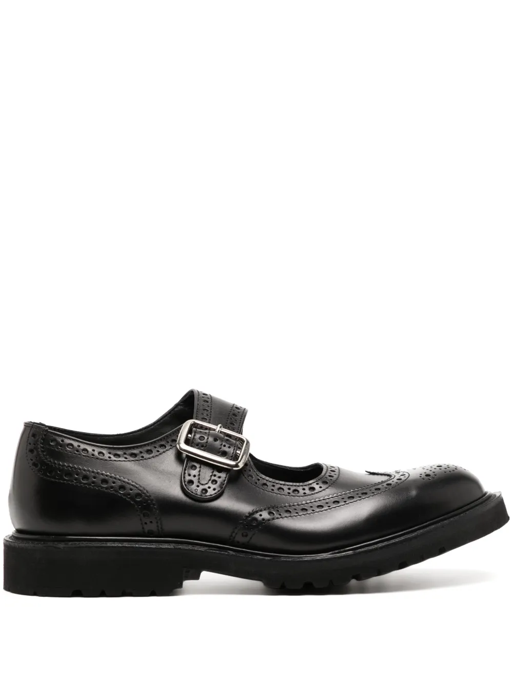 Negro, cuero, puntera redonda, cierre con hebilla, plantilla con logo y tacón bajo.