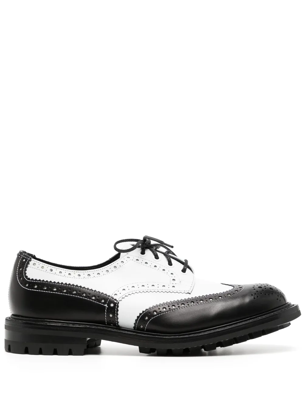 Negro y blanco, cuero, diseño con perforaciones, cierre con cordones en la parte delantera, plantilla con logo, suela de goma y puntera de almendra.