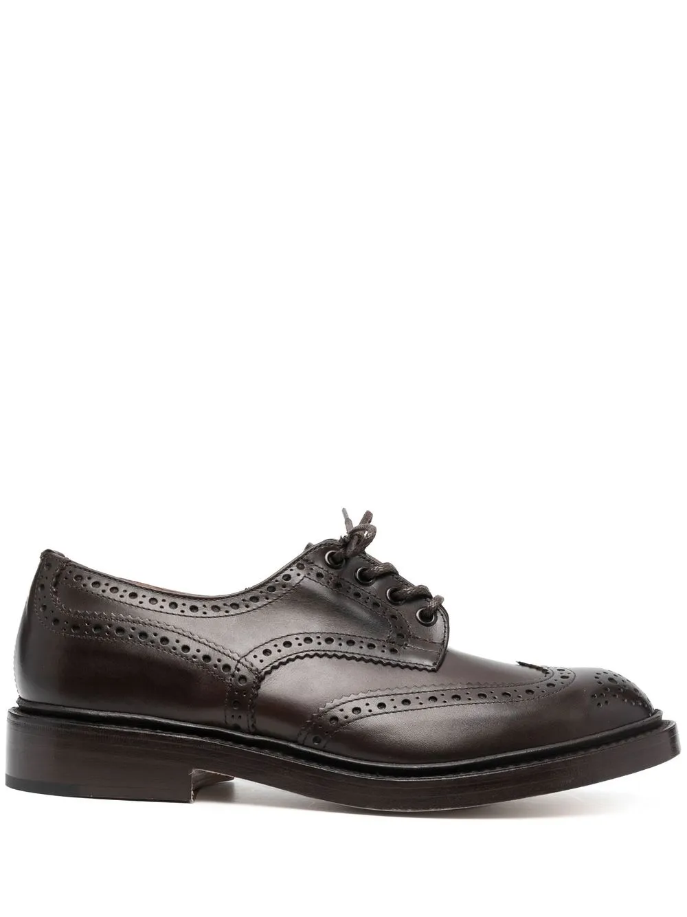 Marrón, piel de becerro, detalle de perforaciones, cierre con cordones en la parte delantera, puntera de almendra, plantilla de piel con logo y suela plana.