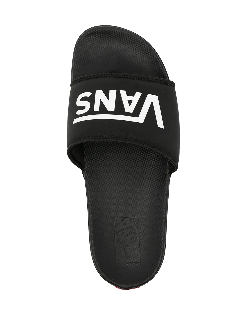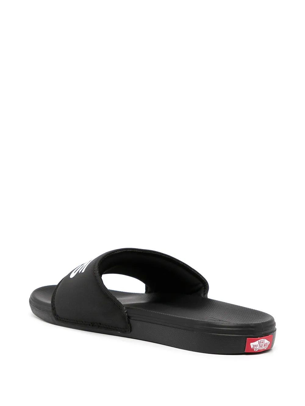 , estampado del logo en la parte delantera, puntera abierta y suela plana de goma.