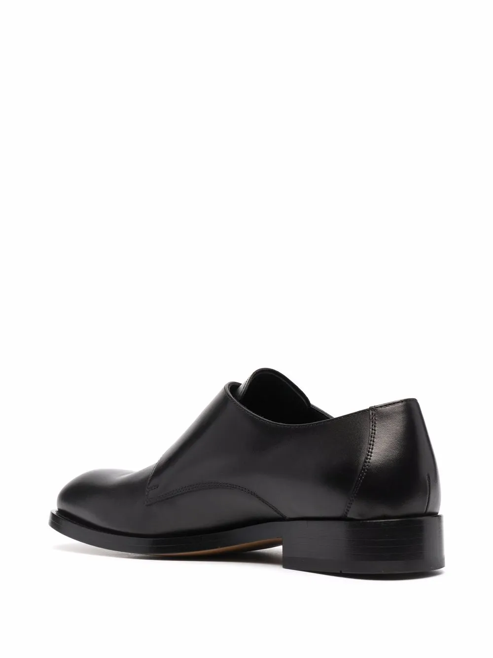 Puntera cuadrada, correa estilo monk, cierre con hebilla en tono plateado, logo grabado, plantilla de piel con logo y tacón grueso. Material: cuero.