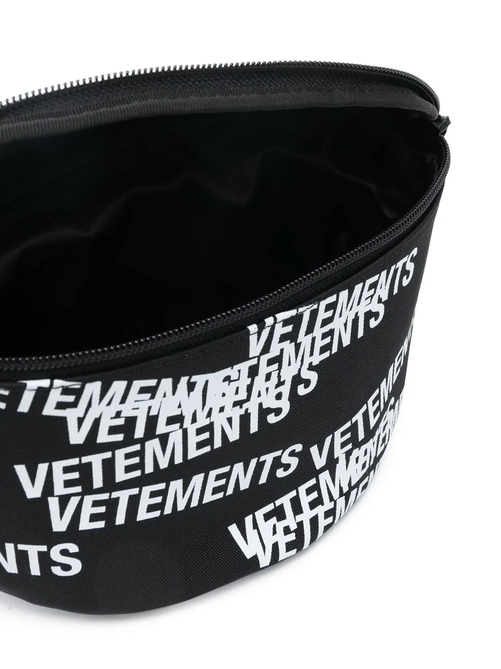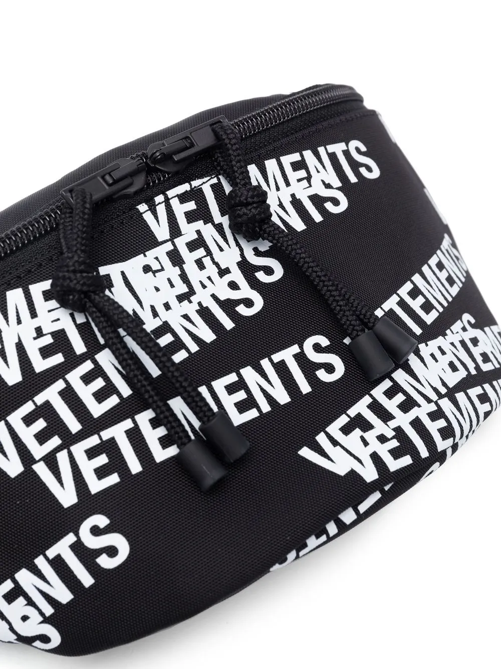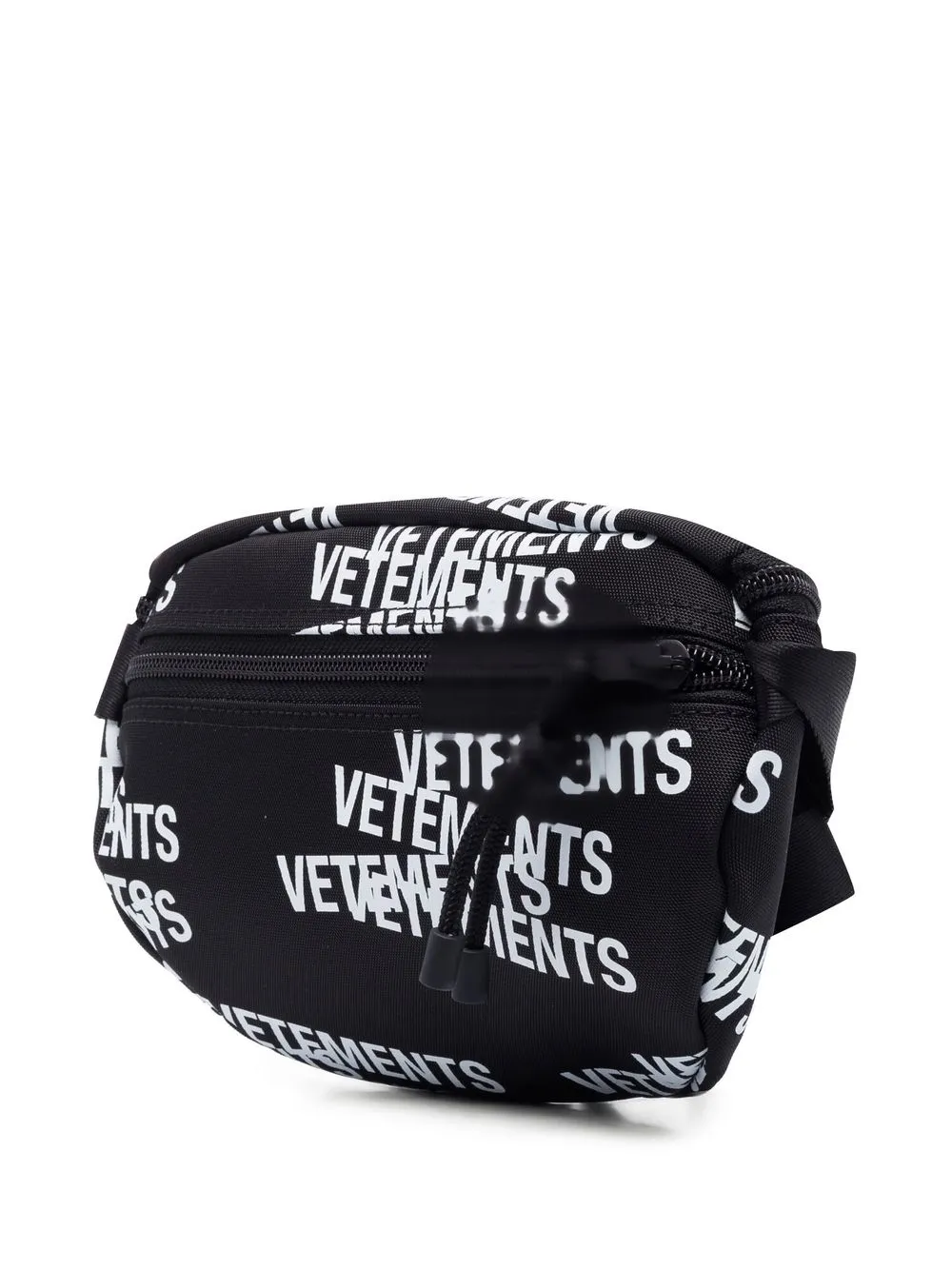 Negro y blanco, estampado del logo en toda la pieza, cierre con cremallera en la parte delantera, correa de cintura ajustable y compartimento principal.