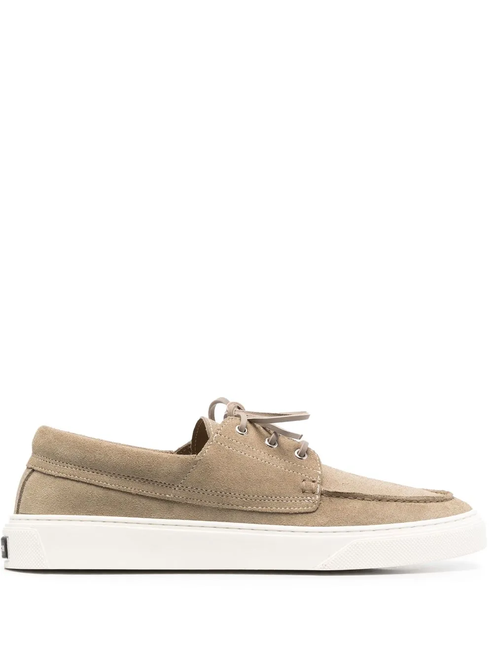 Beige, ante de becerro, puntera de almendra, detalle de cordones, parche del logo en la parte posterior, plantilla con logo y suela plana de goma.