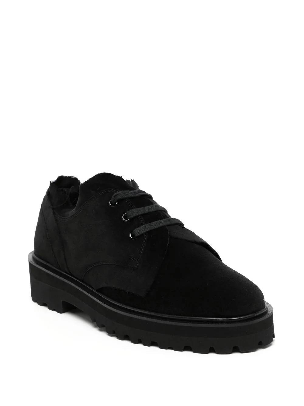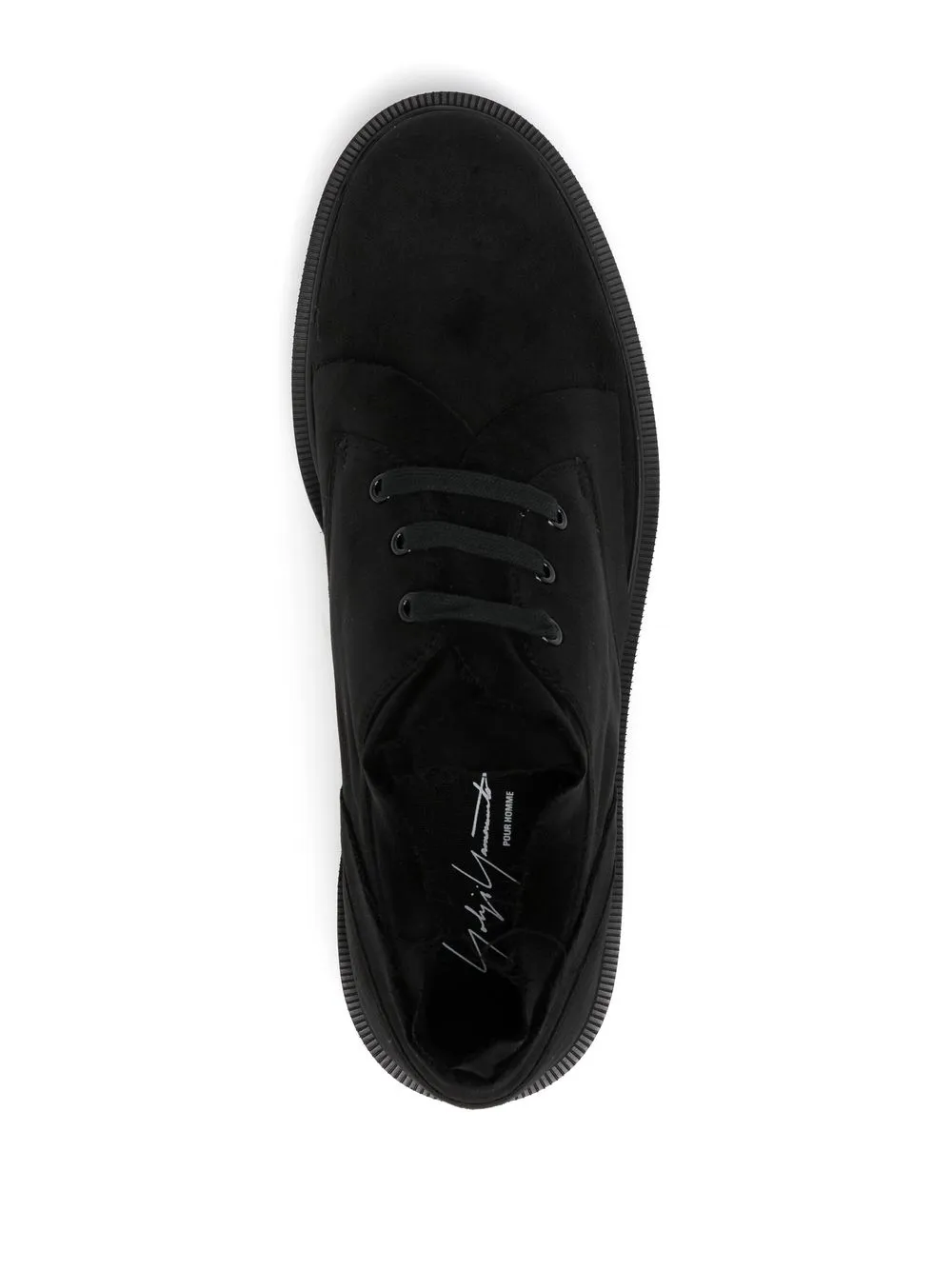 Negro, algodón, puntera de almendra, cierre con cordones en la parte delantera, plantilla de piel con logo y suela plana de goma.