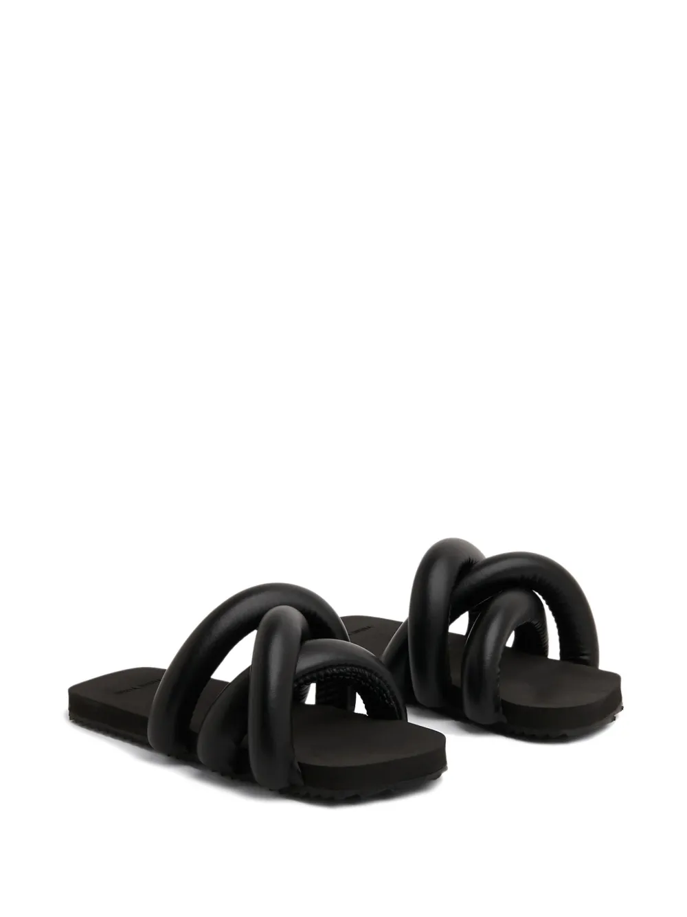 Negro, gamuza, diseño acolchado, detalle de tiras cruzadas, puntera abierta, plantilla con logo, suela plana de goma y estilo slip-on.