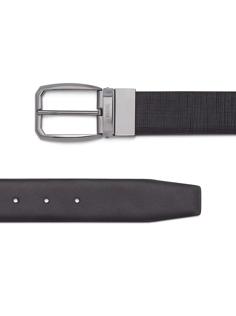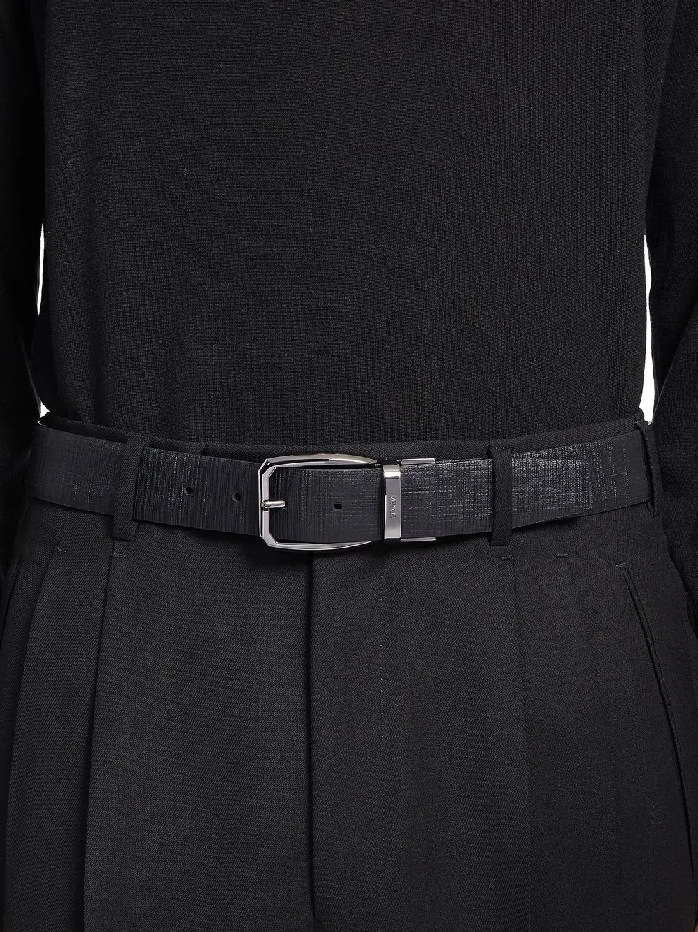 Negro, piel de becerro, reversible, logo grabado, cierre con hebilla y agujeros perforados.