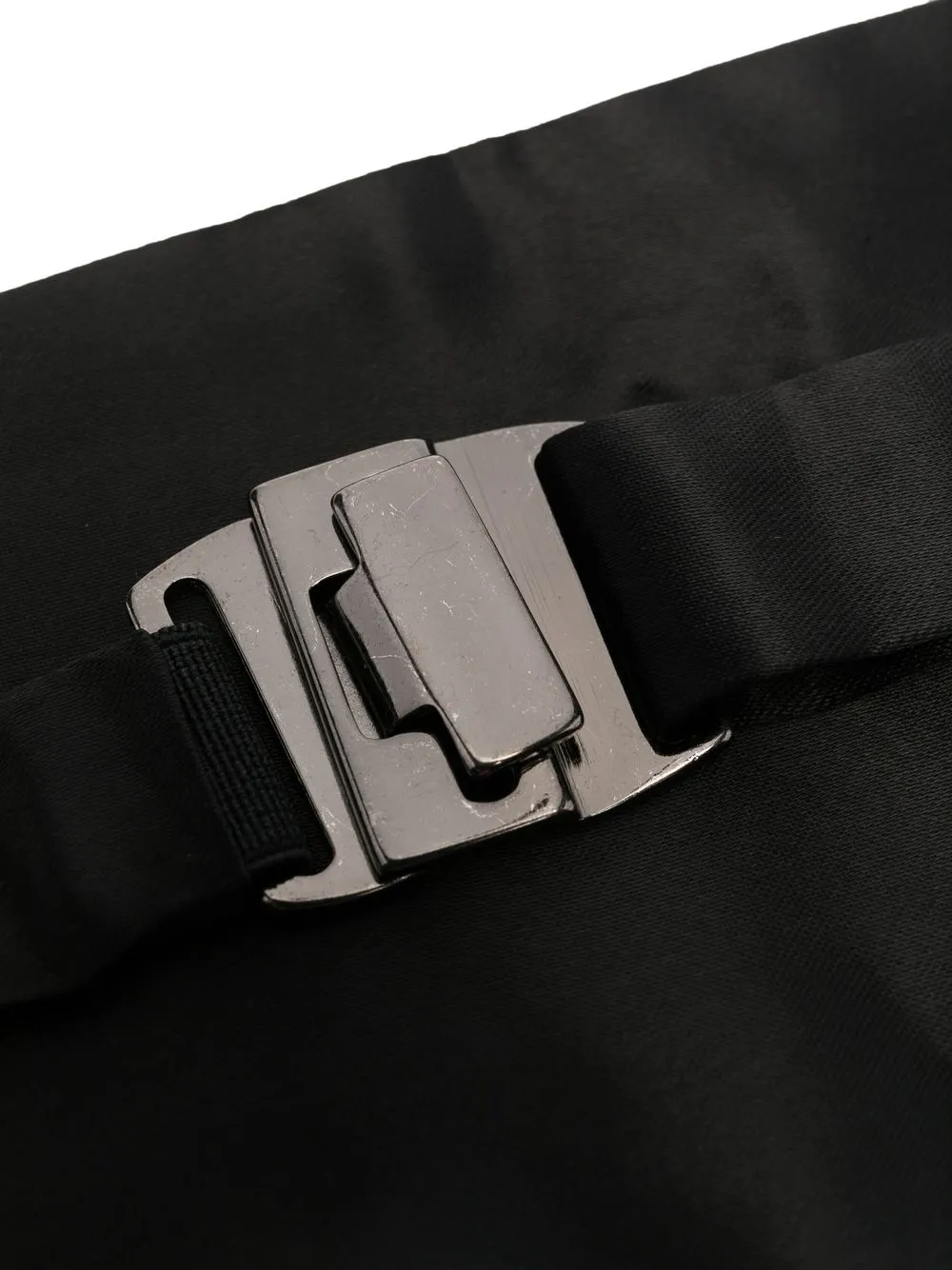 Negro, seda, acabado satinado, detalle de pliegues y cierre con clip en la parte posterior.