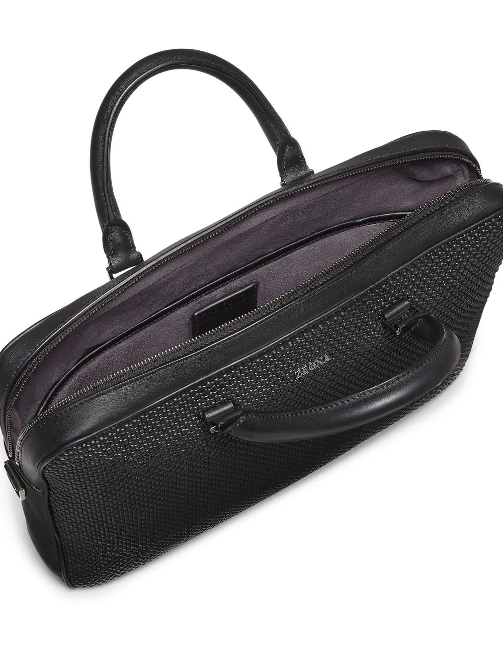 Negro, piel de borrego, acabado texturizado, logo con letras plateadas, dos asas en la parte superior, cierre con cremallera en el tope, asa para el hombro y compartimento principal.