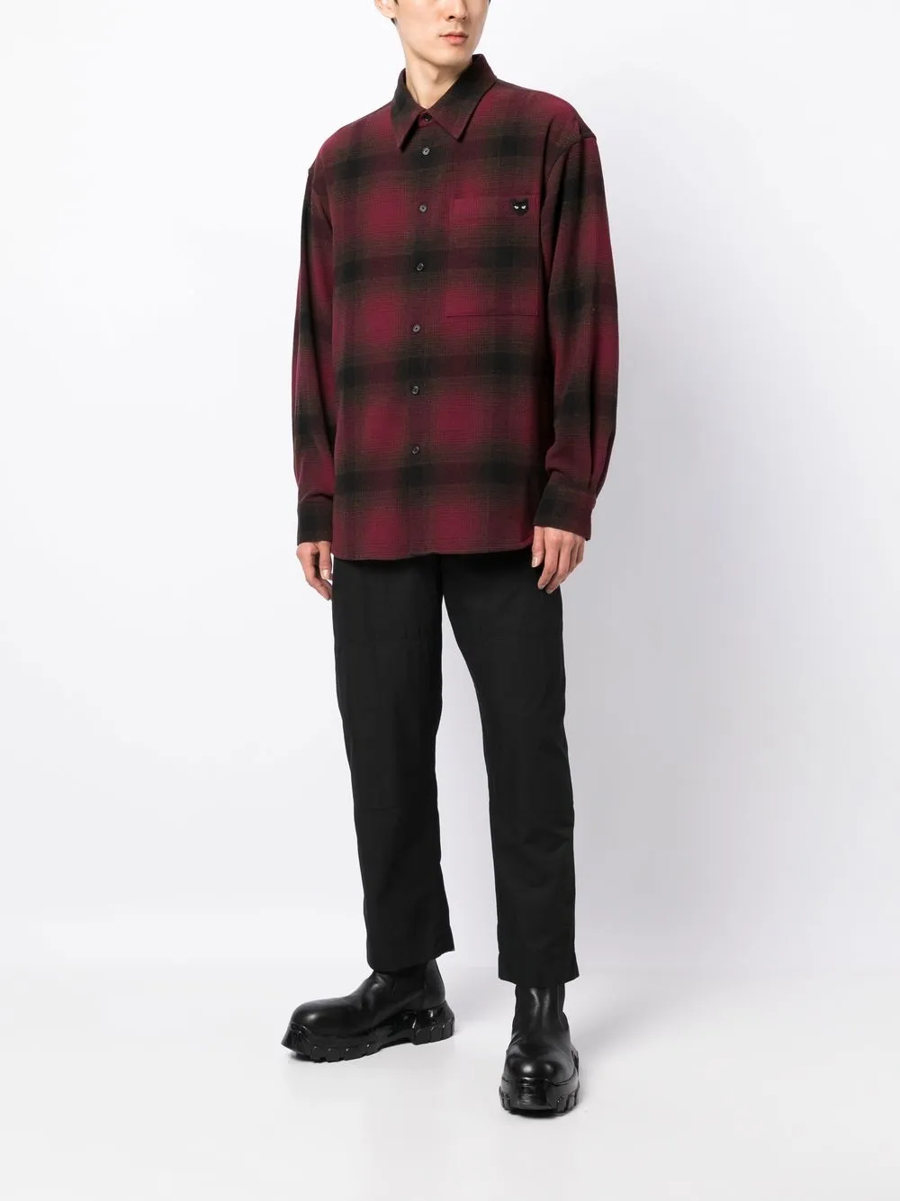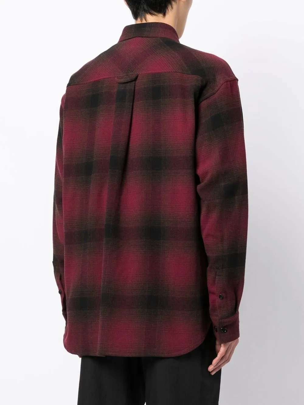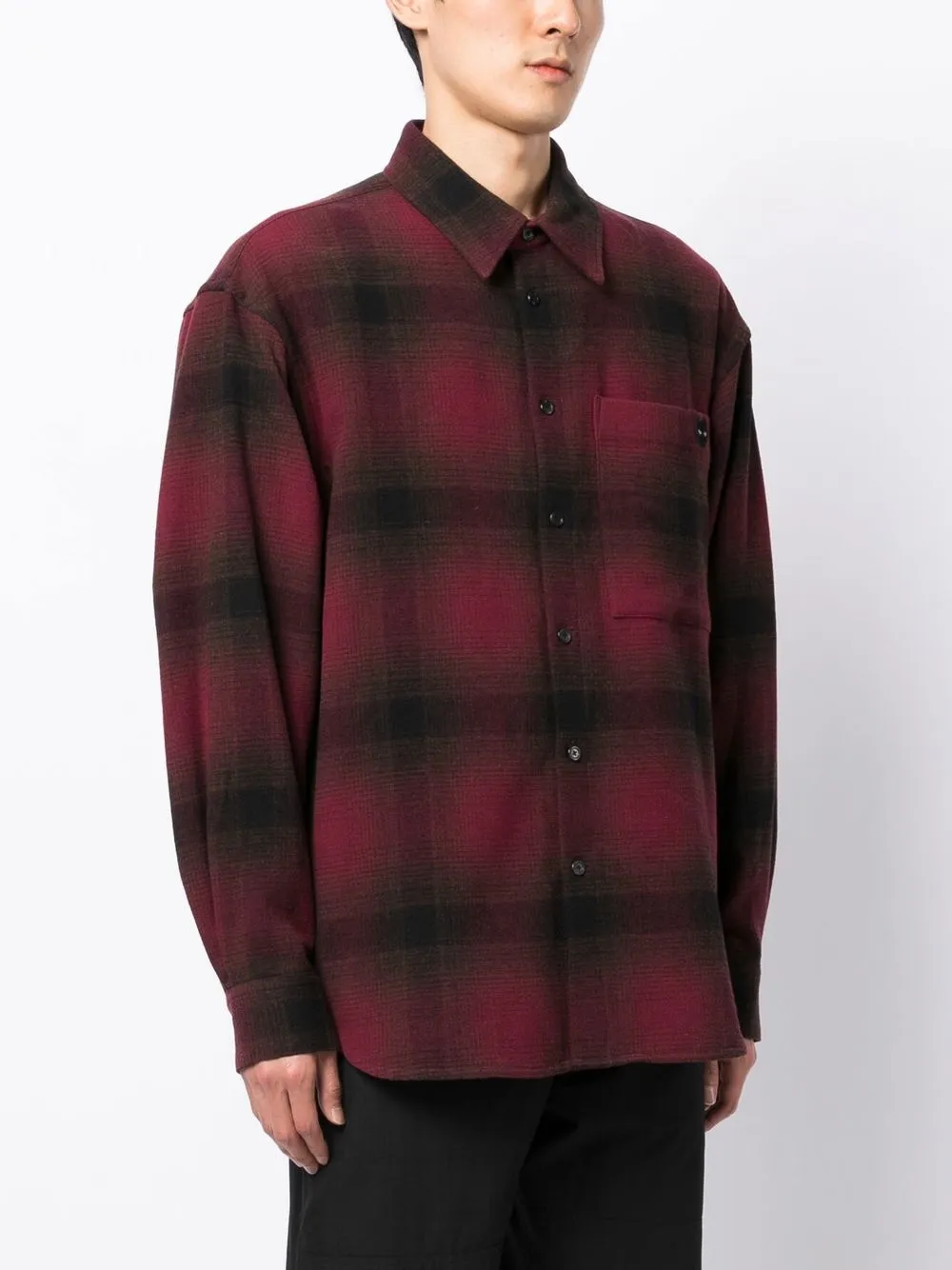 Negro y rojo, lana stretch, motivo a cuadros escoceses, cuello clásico, cierre con botones en la parte delantera, manga larga y bolsillo de parche en el pecho.